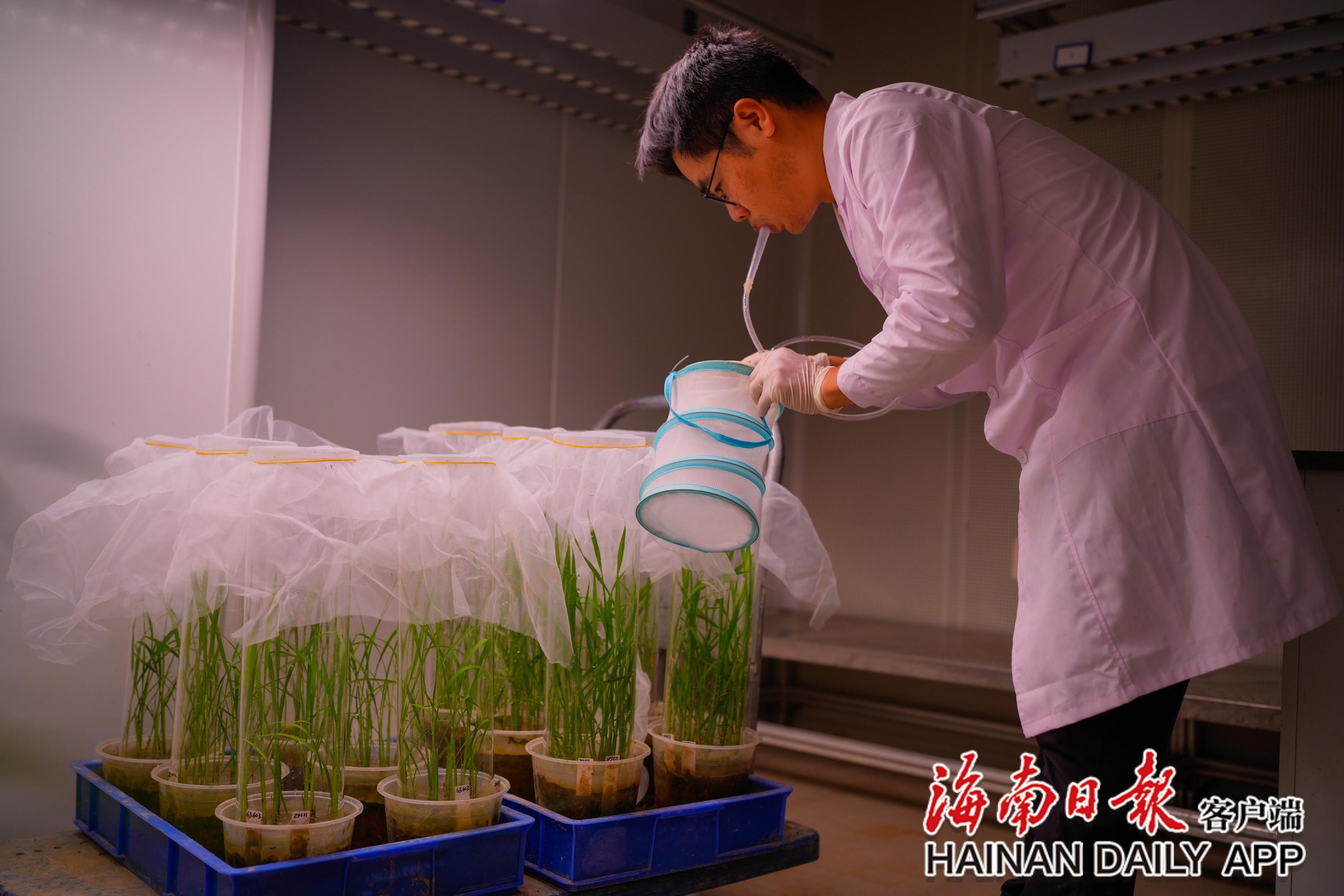 2025年3月30日,中国农科院国家南繁研究院,水稻科学家赵能正利用室内饲育的稻飞虱,对野生稻及栽培稻幼苗开展抗虫性鉴定,筛选出优异的抗虫种质资源。