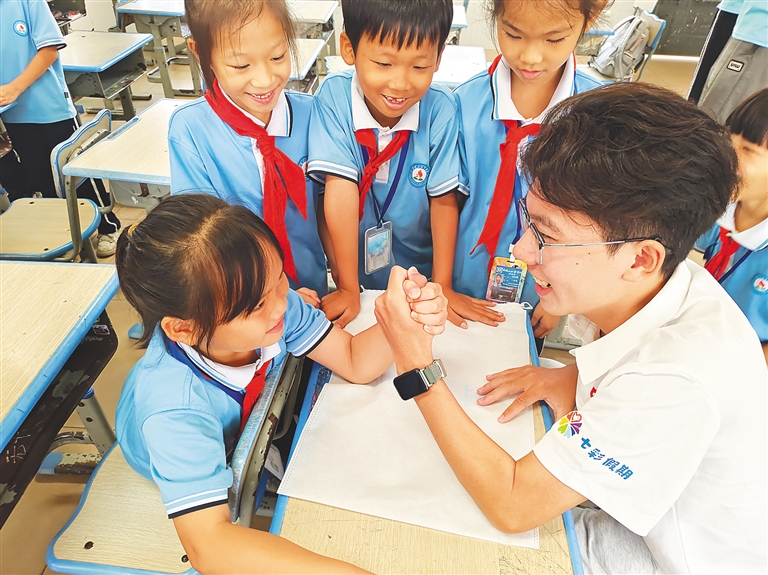 活动还吸引了外国友人加入。海南大学中和书院手拉手中外学生志愿服务队来到海口市琼山区旧州镇文化服务站暑期爱心托管班,通过“中外学生1+1全程搭档”的形式,开展有关环保的双语活动。