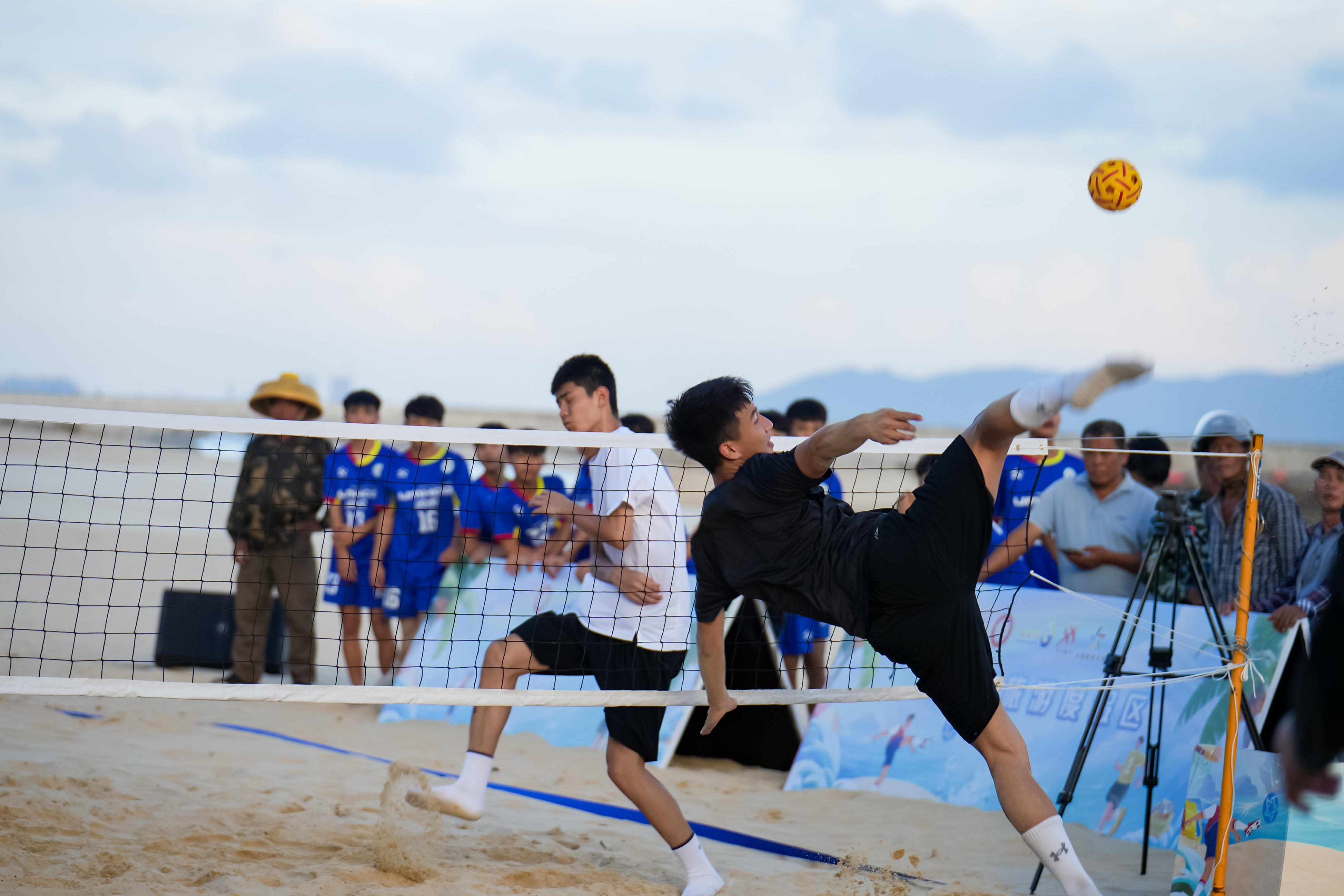 作为本次藤球全民健身推广活动的核心环节,展演赛汇聚了多支来自各地的藤球队伍,其中既有经验丰富的专业选手,也有崭露头角的青少年爱好者。比赛现场,运动员们充分展现藤球运动魅力——融合足球的技巧与排球的战术,用脚腕、膝关节、肩部等部位完成夹球、顶球、传球等动作,腾空转体抽射、倒钩扣球等高难度技巧不断上演,将这项运动的力与美诠释得淋漓尽致,每一次精彩得分都引得沙滩上的观众阵阵欢呼。