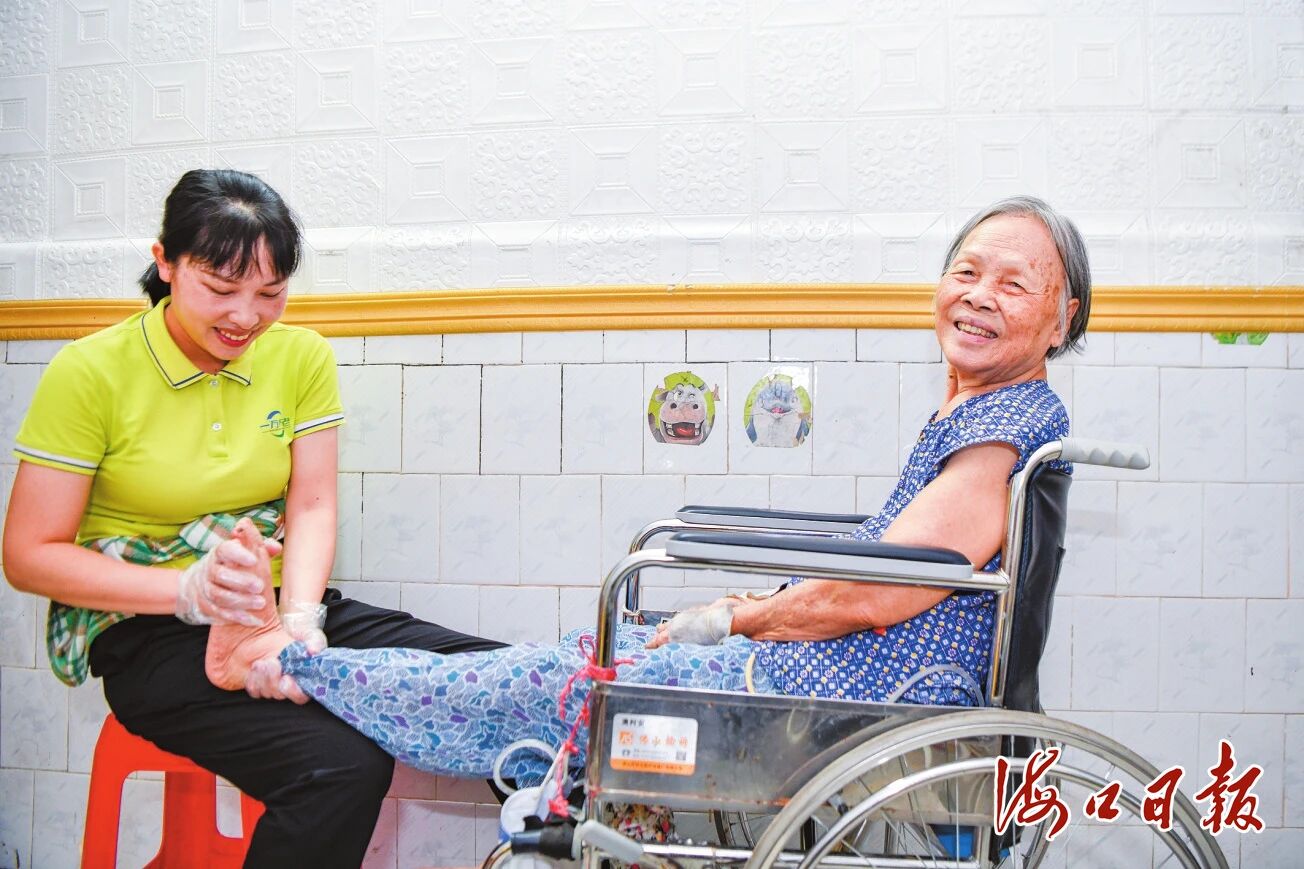 10月20日,在海口市凤翔街道三峰社区,凤翔街道综合养老服务中心的工作人员上门为老人进行腿部护理。海口市融媒体中心记者 苏弼坤 摄