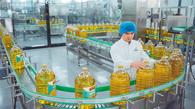 作为全国首家享受加工增值内销免关税政策的试点企业,海南澳斯卡国际粮油有限公司车间生产繁忙。海南日报全媒体记者张茂 摄