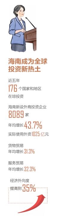 近五年,海南新设外商投资企业8089家,年均增长43.7%,实际使用外资1025亿元,年均增长14.6%,176个国家和地区在琼投资,海南已成为全球投资新热土;原辅料、自用生产设备、交通工具及游艇“零关税”和加工增值内销免关税等政策持续发力,为海南外贸增长注入强劲动力,货物贸易、服务贸易年均增长31.3%和32.3%;经济外向度提高到35%。