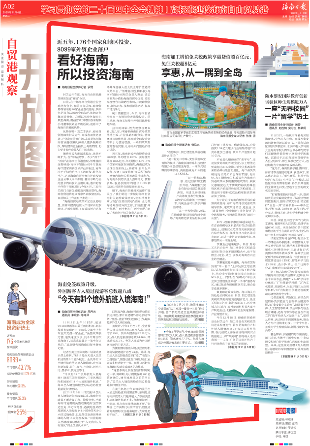 11月2日上午10时许,航班TR118降落海口美兰国际机场,新加坡旅客吴瑞财下飞机后,立即坐上专车直奔文昌一家企业。“免签政策很方便,通关速度很快,我今年第三次来海南了,这次来是敲定一笔全年订单的。”吴瑞财告诉海南日报全媒体记者。