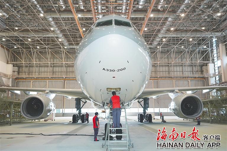 海南自贸港一站式飞机维修产业基地,工作人员对一架卡塔尔籍客机进行维修。海南日报全媒体记者 王程龙 摄