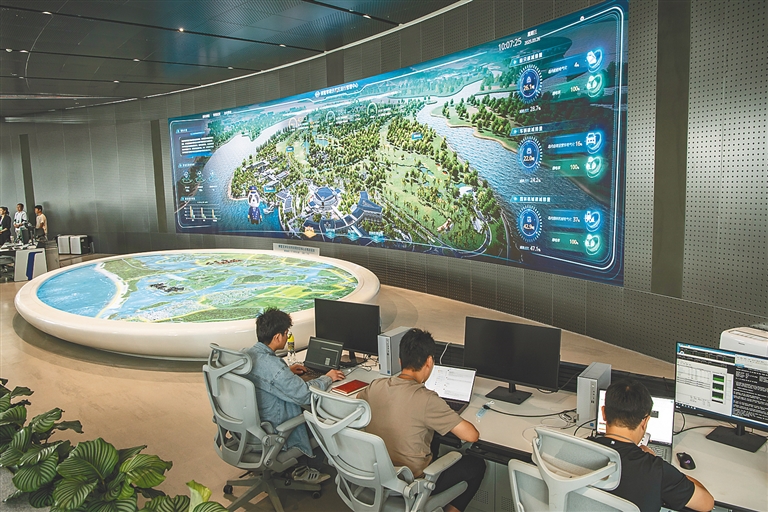 在博鳌东屿岛零碳示范区运行管理中心,工作人员在监测设备运行。东屿岛已实现“八位一体”区域降碳布局,实现零碳运行,是我国首个以更新改造模式实现区域整体零碳运行的样本。特约记者 蒙钟德 摄