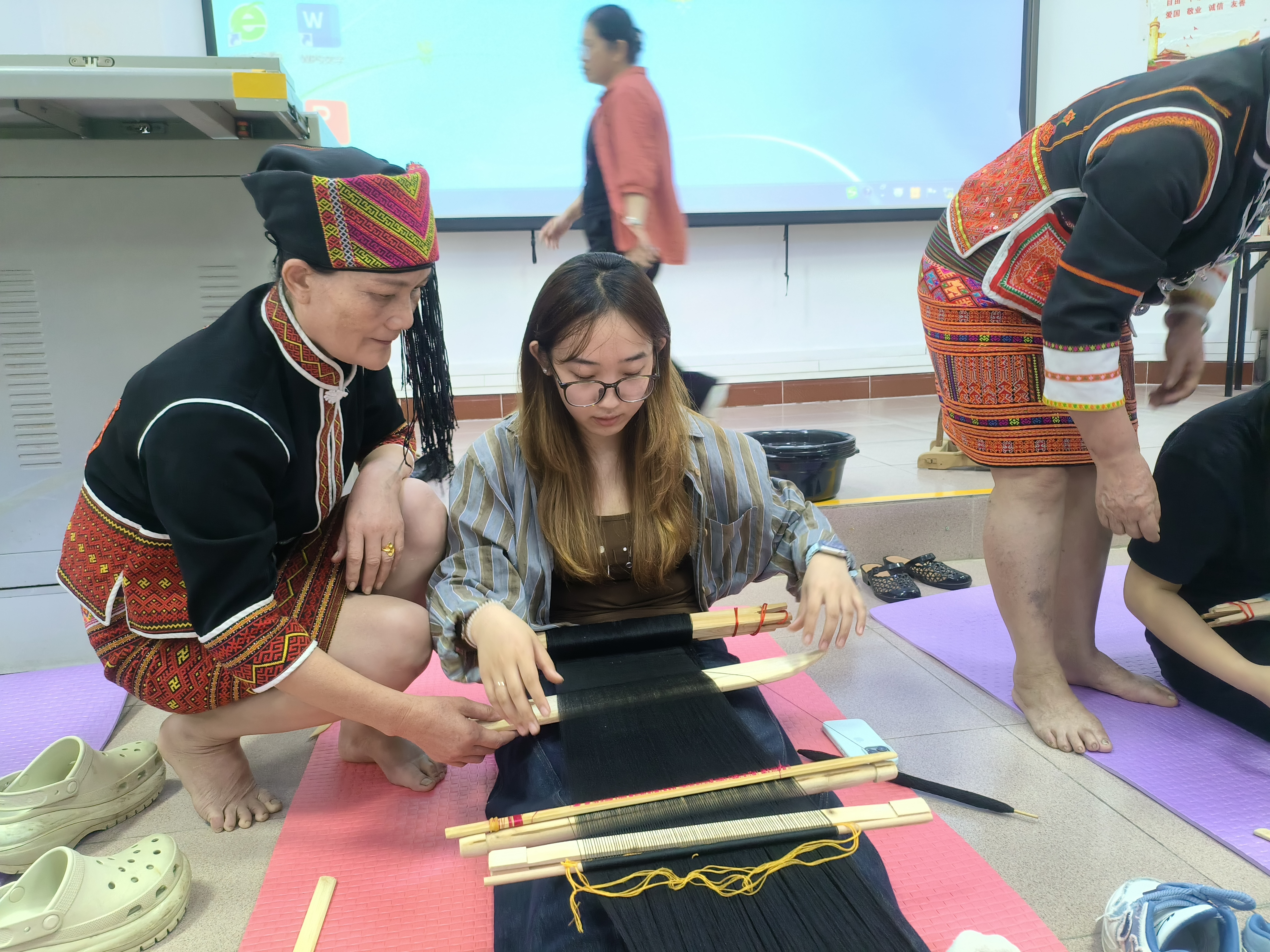 课堂上,学生在非遗代表性传承人指导下体验织黎锦。