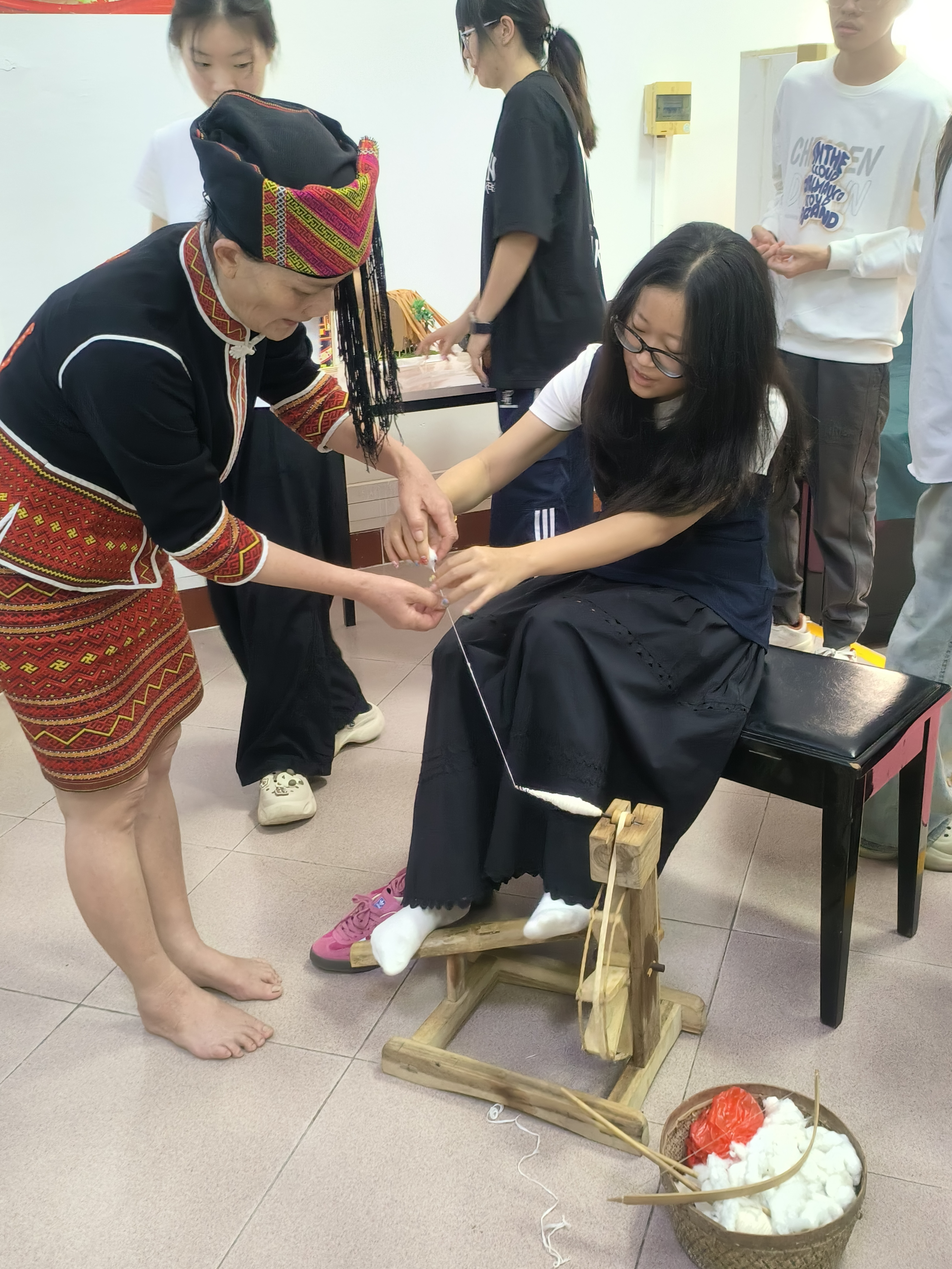 课堂上,学生们在传承人的悉心指导下,亲身参与黎锦制作的全过程。他们尝试用古老的纺轮将海岛棉捻成纱线,学习神奇的“染”技艺。最后,大家轮流坐上传统的踞腰织机,在传承人“手把手”的引导下,运用挑花刀与梭子,将染好色的丝线织成一片片纹样精美的布片。这种“讲、演、学、做”融为一体的教学模式,不仅让学生们感受了黎锦制作的核心技艺,更让他们深刻体会到每一道工序背后所蕴含的黎族智慧与匠心精神。