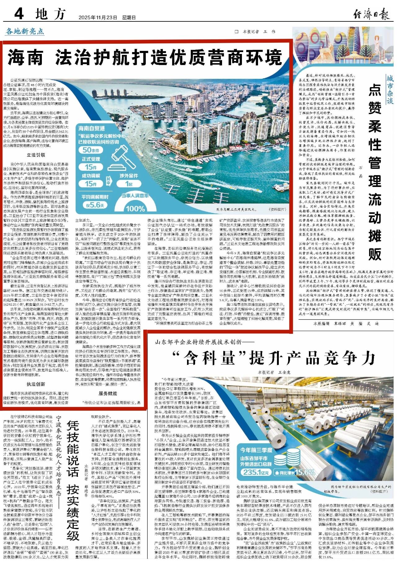 近年来,海南以法治建设为核心牵引,全力打造稳定、公平、透明、可预期的一流营商环境,为各类经营主体提供坚实的法治保障。在11月6日举办的2025中国侨商投资(海南)大会上,共签约38个合作项目,总金额达362.31亿元。如今,越来越多来自国内外的投资者和企业,投资海南、落户海南,法治化营商环境正成为海南自贸港建设的有力支撑。