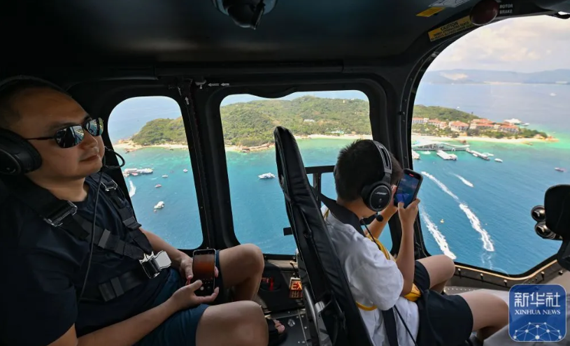 游客在三亚海棠湾直升机观光基地(林阳通航)体验直升机飞行。图源于新华社