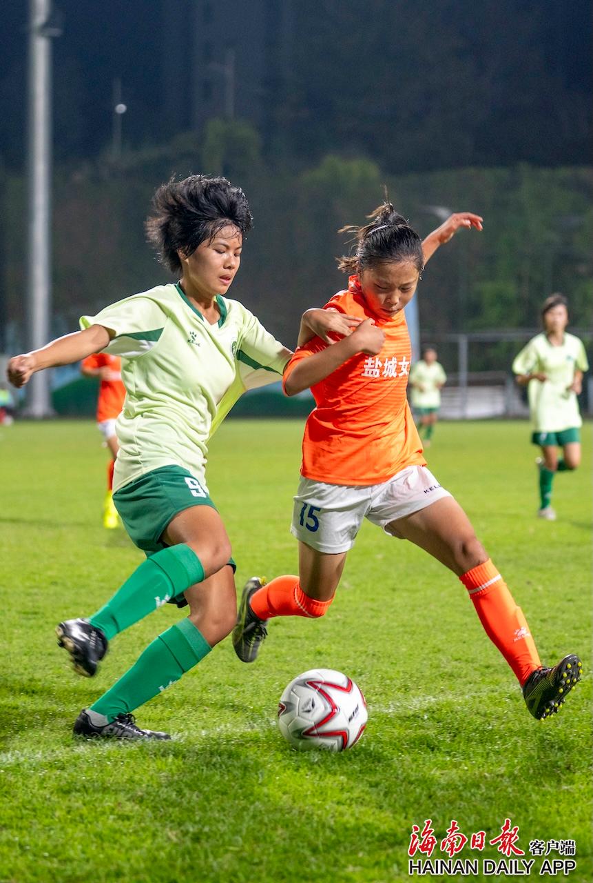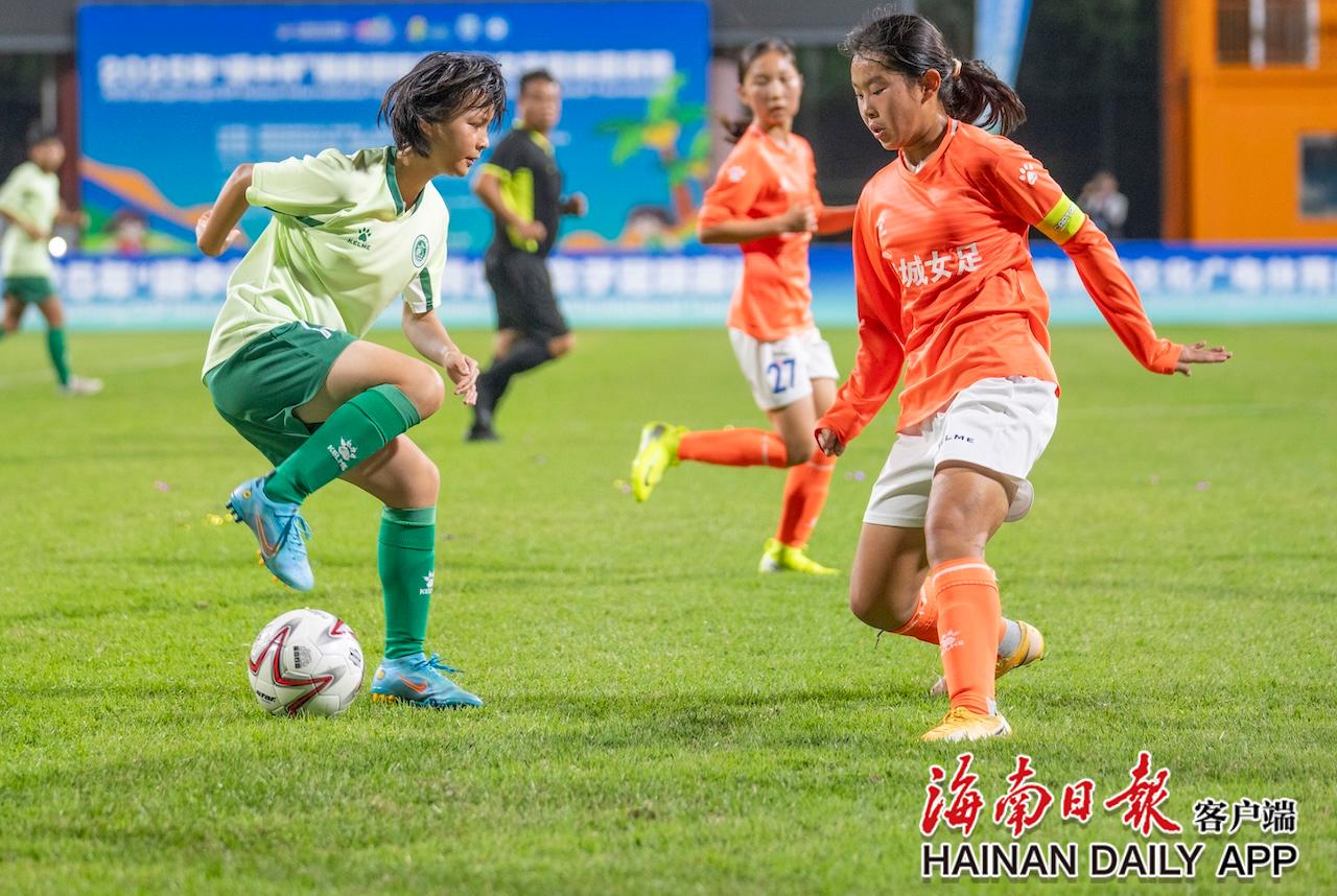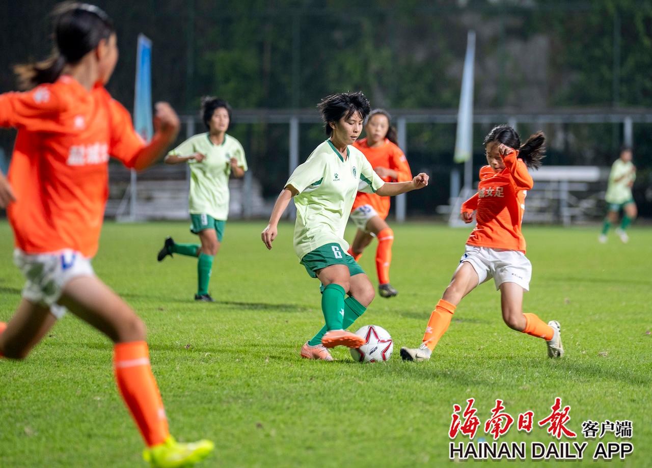11月26日,2025年“琼中杯”海南国际青少年女子足球邀请赛在琼中黎族苗族自治县开赛,琼中女足队员(左)和盐城女足队员拼抢足球。海南日报全媒体记者 李天平 摄