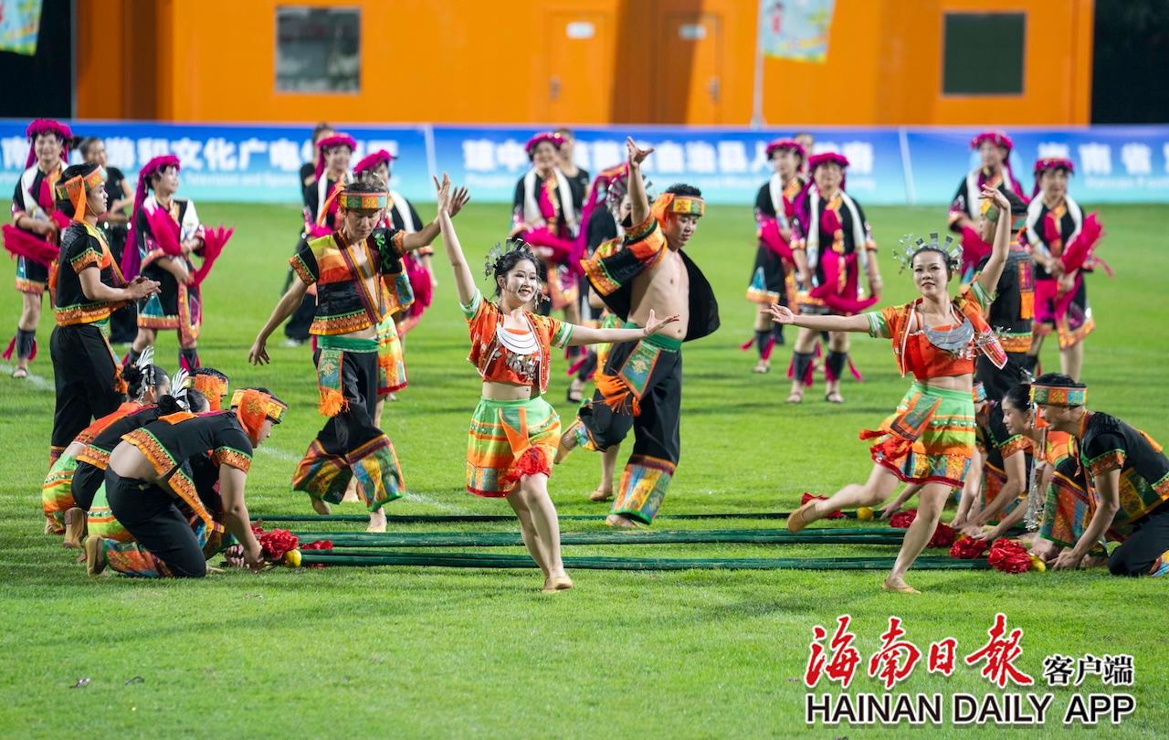 11月26日,2025年“琼中杯”海南国际青少年女子足球邀请赛在琼中黎族苗族自治县开幕。图为开幕式上的竹竿舞表演。海南日报全媒体记者 李天平 摄