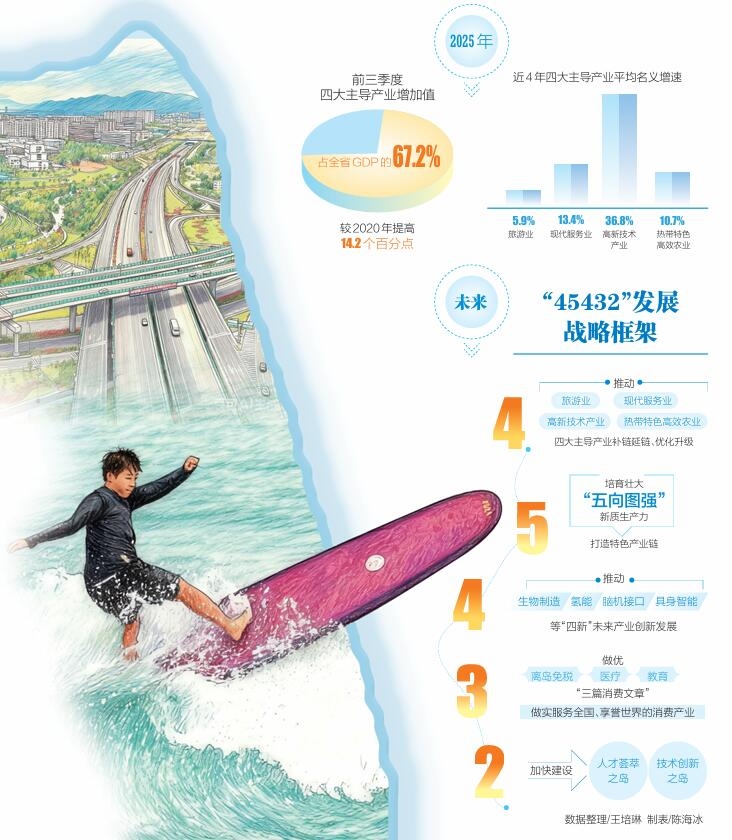 据了解,2025年前三季度,四大主导产业增加值占全省GDP比重达67.2%,旅游业、现代服务业、高新技术产业和热带特色高效农业近4年平均名义增速分别达到5.9%、13.4%、36.8%、10.7%,实体经济基本盘和主引擎作用持续强化。