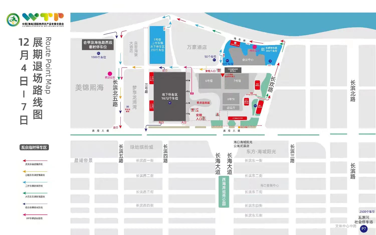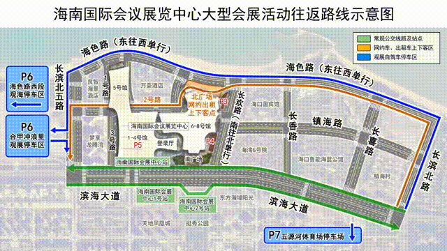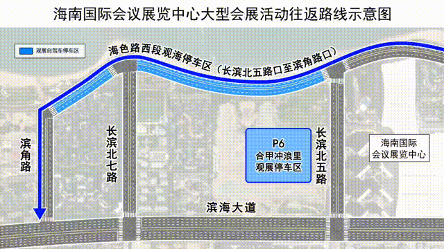 长滨北路→海色路→长滨北五路→P6合甲冲浪里及海色路停车区,或前往P7五源河体育场停车场公交摆渡往返。