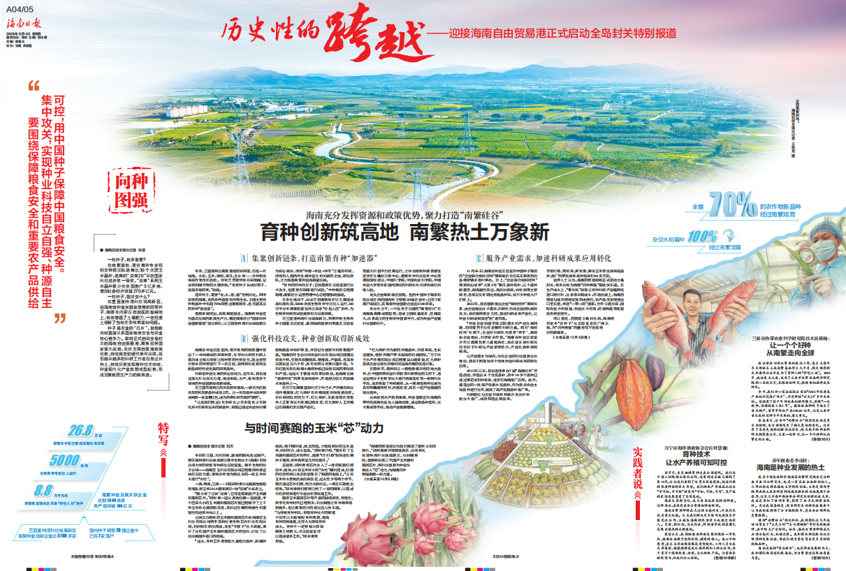 种子是农业的“芯片”,其创新突破直接关系国家粮食安全与农业核心竞争力。即将正式启动全岛封关的海南自由贸易港,聚焦服务国家重大战略,充分发挥自贸港政策优势,持续完善软硬件条件保障,吸引越来越多的科研工作者投身这片热土,持续探索实现育种技术突破,种业现代化产业集群成型起势,形成发展新质生产力的新赛道。