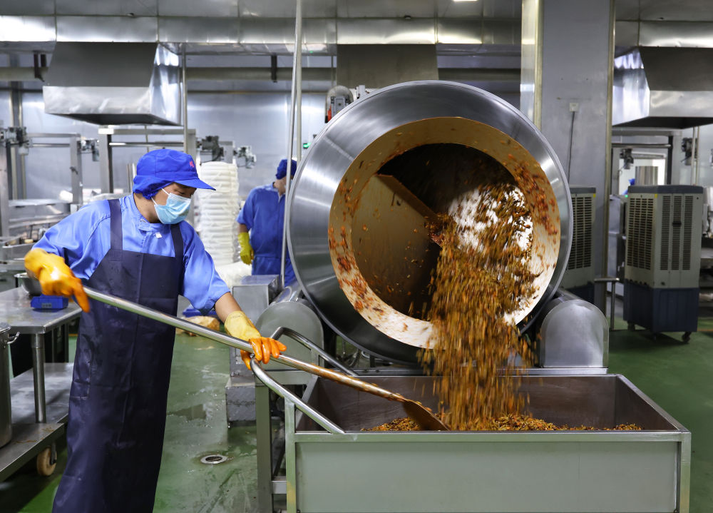 柳州市螺蛳粉产业园的一家螺蛳粉生产企业工作人员在腌制酸豆角。图源于新华社