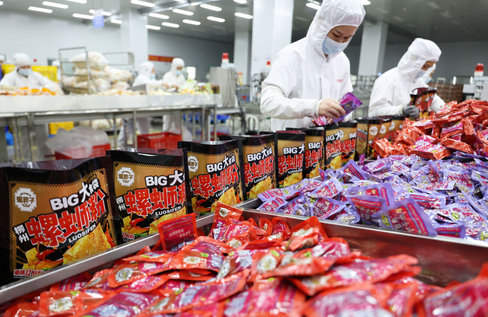 柳州市螺蛳粉产业园一家螺蛳粉生产企业工作人员在包装螺蛳粉。图源于新华社