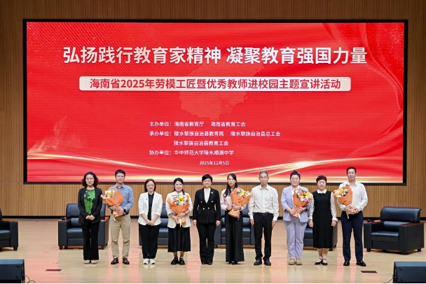 12月5日,以“弘扬践行教育家精神,凝聚教育强国力量”为主题的海南省2025年劳模工匠暨优秀教师进校园主题宣讲活动(陵水场)在华中师范大学陵水顺湖中学举行。