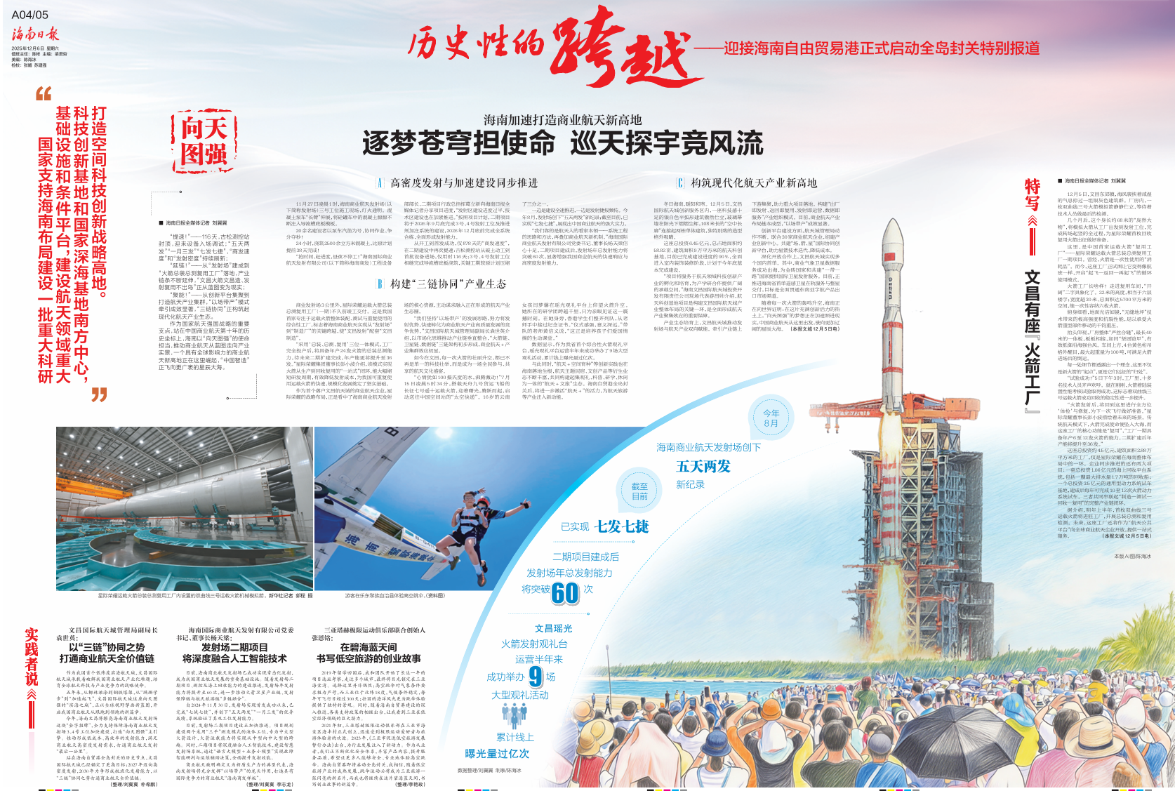 今年,海南文昌将擦亮海南商业航天发射场这块“金字招牌”,全力支持保障海南商业航天发射场3、4号工位加快建设,打造“向天图强”主引擎。推动形成低成本、高效率的发射能力,满足商业航天高密度发射需求,打通商业航天发射“最后一公里”。