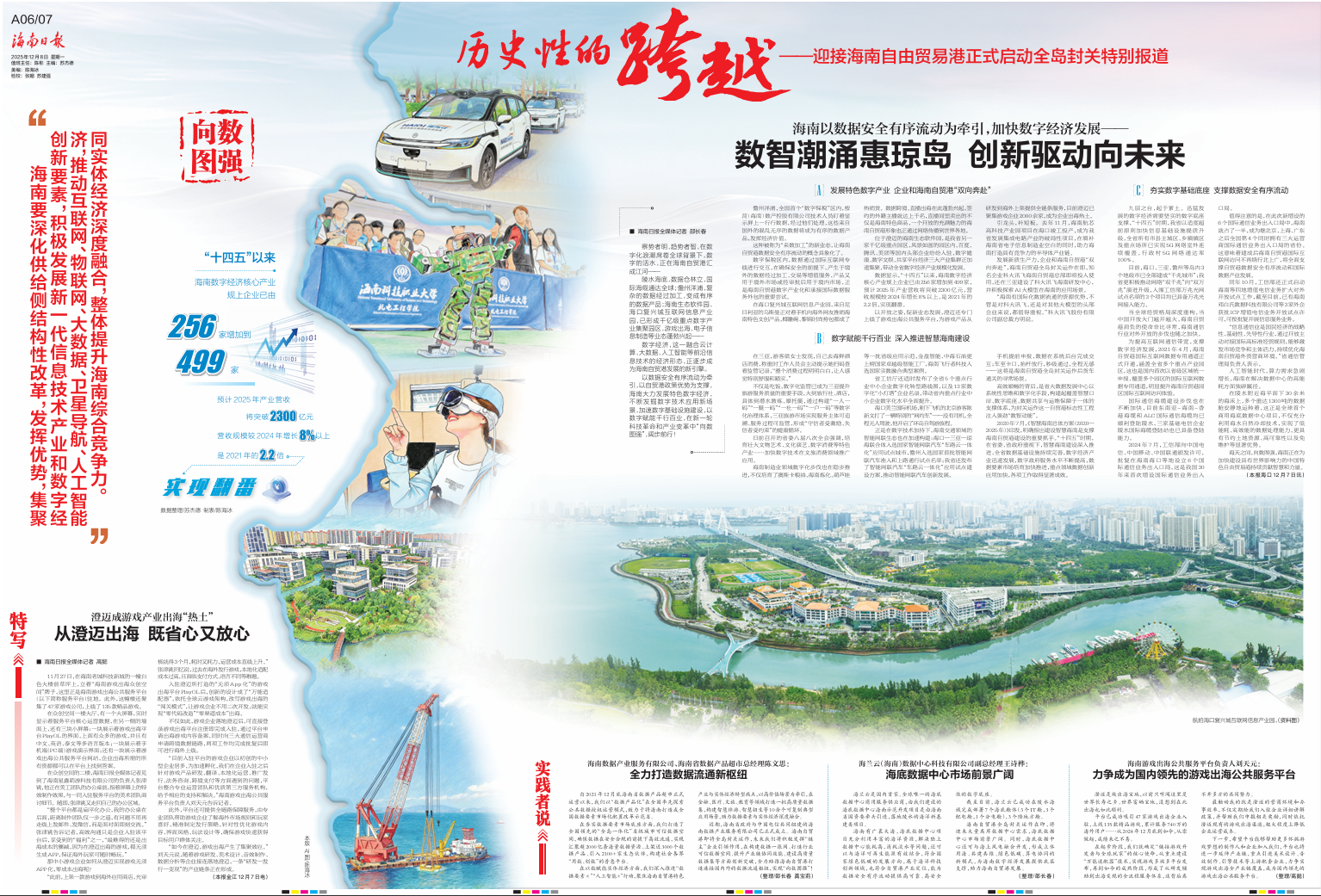 陵水海底,数据仓林立,国际海缆通达全球;儋州洋浦,复杂的数据经过加工,变成有序的数据产品;海南生态软件园、海口复兴城互联网信息产业园,已形成千亿级重点数字产业集聚园区,游戏出海、电子信息制造等业态蓬勃兴起——