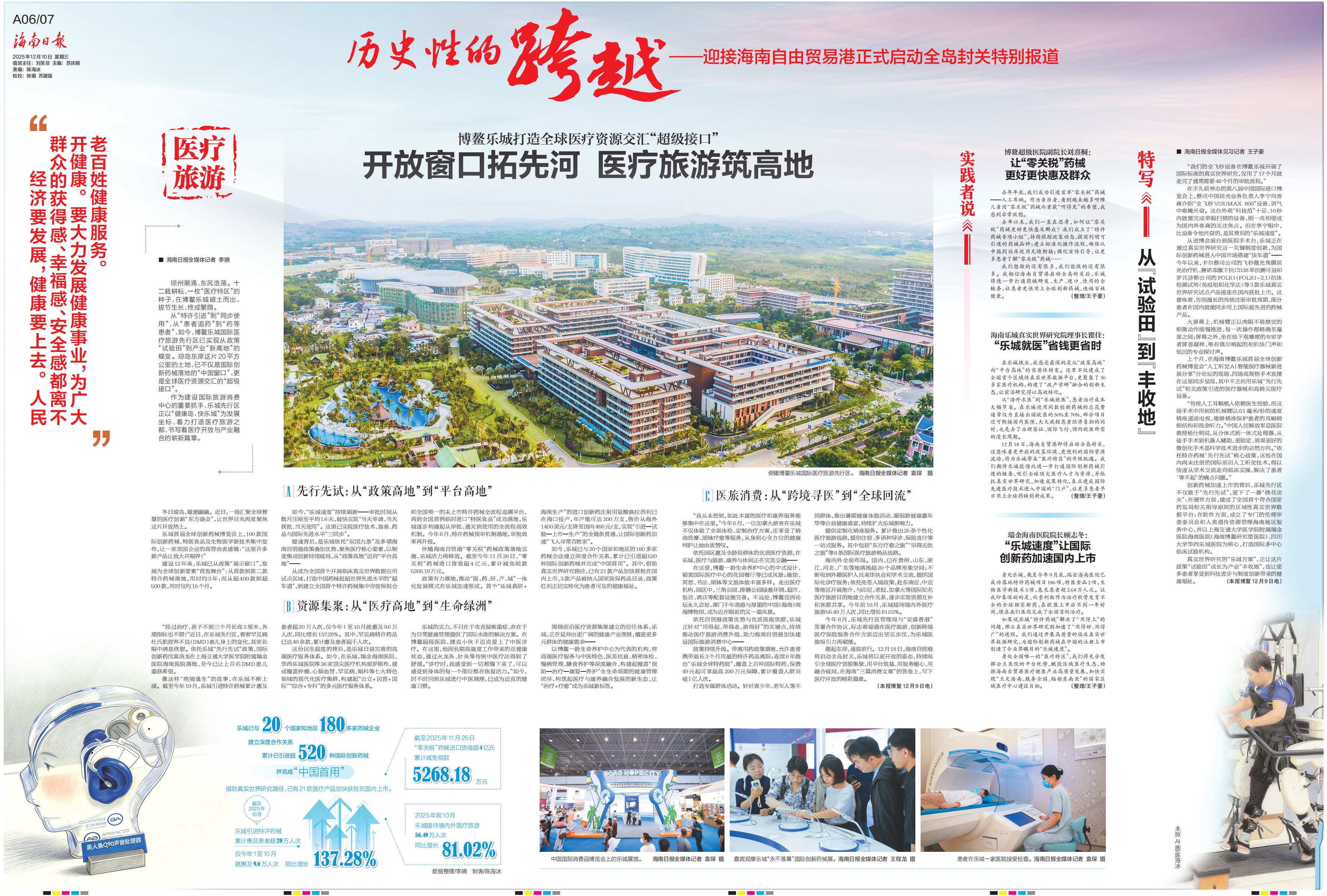 12月18日,海南自贸港即将启动全岛封关,这意味着更开放的政策环境、更便利的国际资源流动,将为乐城带来“医疗特区”的升级机遇。我们期待乐城能借此进一步打通国际创新药械引进的链条,吸引全球顶尖医疗人才与资源,并依托真实世界研究,加速成果转化,真正建成国际先进医疗技术进入中国的“门户”,让更多患者早日用上全球药械创新成果。(整理/王子豪)