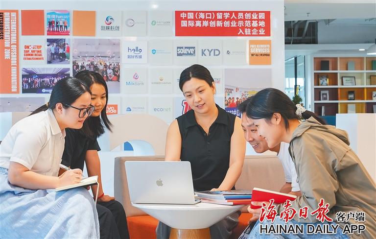 位于海口复兴城园区的中国(海口)留学人员创业园内,知行见(海南)教育科技有限公司工作人员在讨论留学国家优秀案例。该公司去年落地海口后,积极与海南热带海洋学院等院校建立战略合作,开展来华留学和签证服务,助力海南自贸港国际化人才建设。海南日报全媒体记者 张茂 摄
