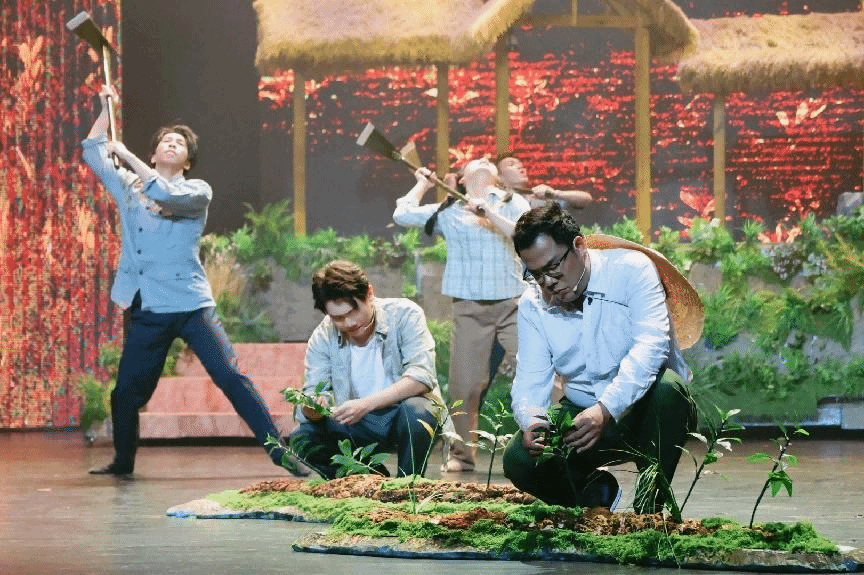剧中,何康(右一)黄宗道(右二)率领众人开荒种橡胶。海南大学国际传播与艺术学院 供图