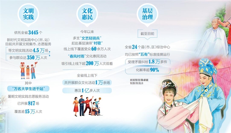 一次次丰富多彩的文明实践活动,依托全省3445个新时代文明实践中心(所、站),推动优质资源下沉,惠及基层百姓,目前共开展文明集市、志愿服务等文明实践活动4.5万场,参与群众达350万人次;