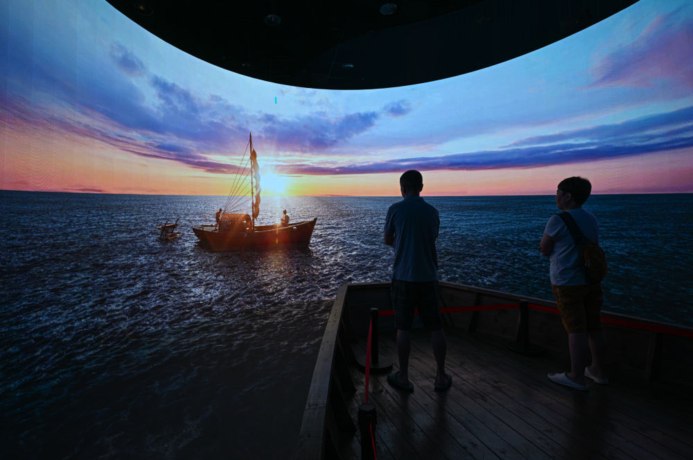 2025年5月13日,游客在海南疍家博物馆观看展现疍家人下海采集珍珠场景的动画。(新华社发)