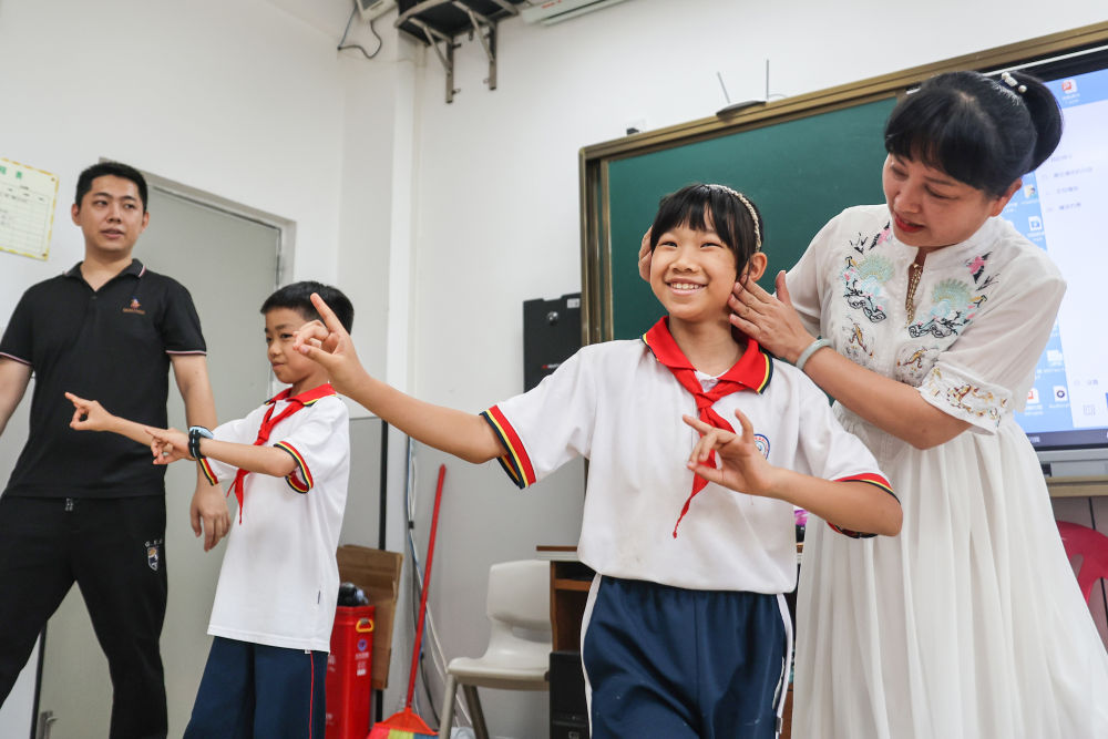海南定安县琼剧团的演员指导定安县第一小学的学生们练习琼剧。(新华社发)