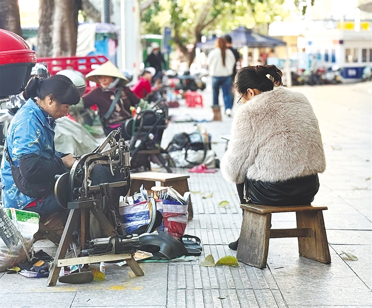 “要擦鞋吗?”“哪里要补?”……上午10时后,客人渐多,符月莲一边“接单”,手中的活停不下来。裁剪、缝线、打磨、修饰,一套流畅的动作落定,破损的鞋或包很快便修复如初。