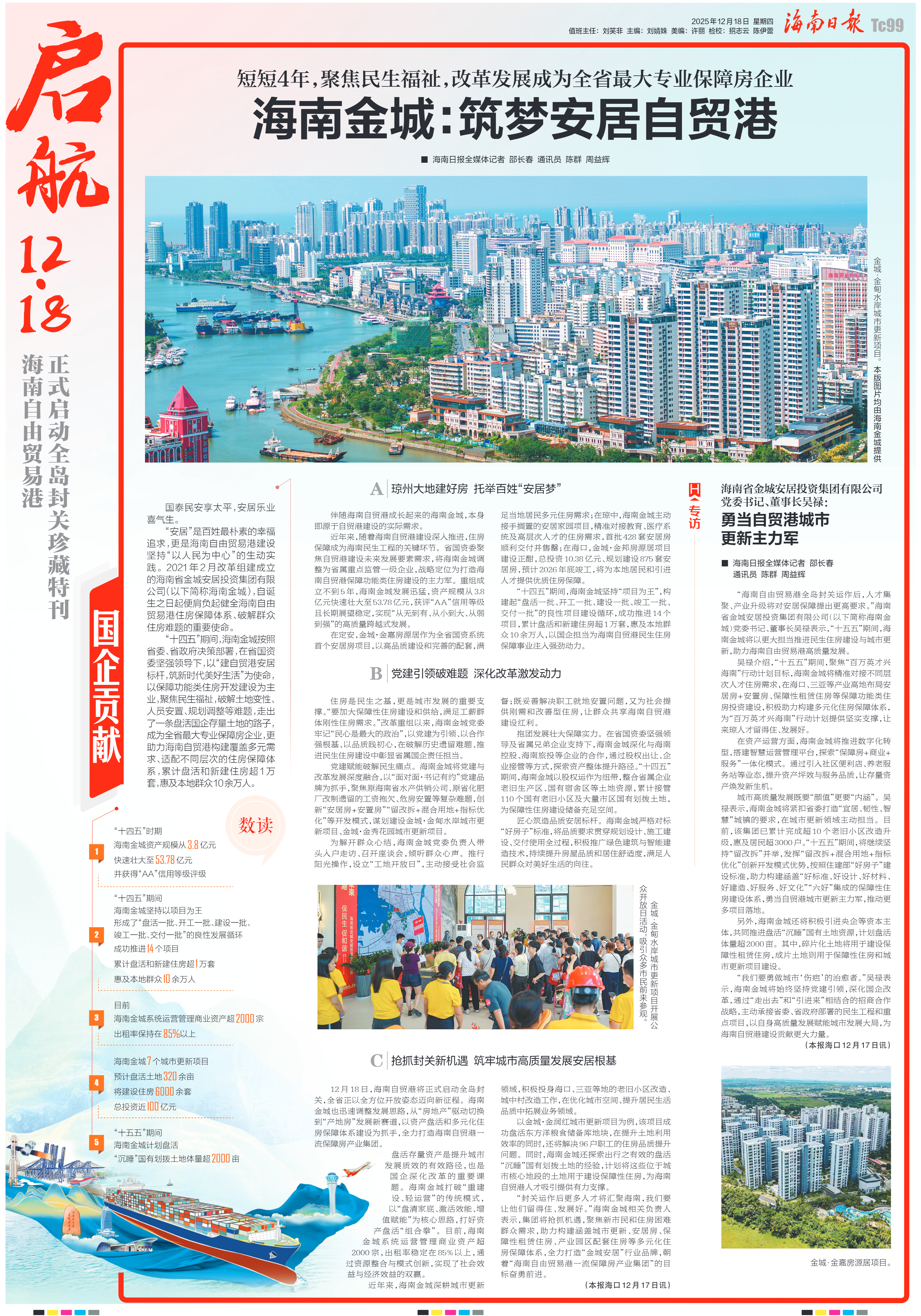 12月18日,海南自贸港将正式启动全岛封关,全省正以全方位开放姿态迈向新征程。海南金城也迅速调整发展思路,从“房地产”驱动切换到“产地房”发展新赛道,以资产盘活和多元化住房保障体系建设为抓手,全力打造海南自贸港一流保障房产业集团。
