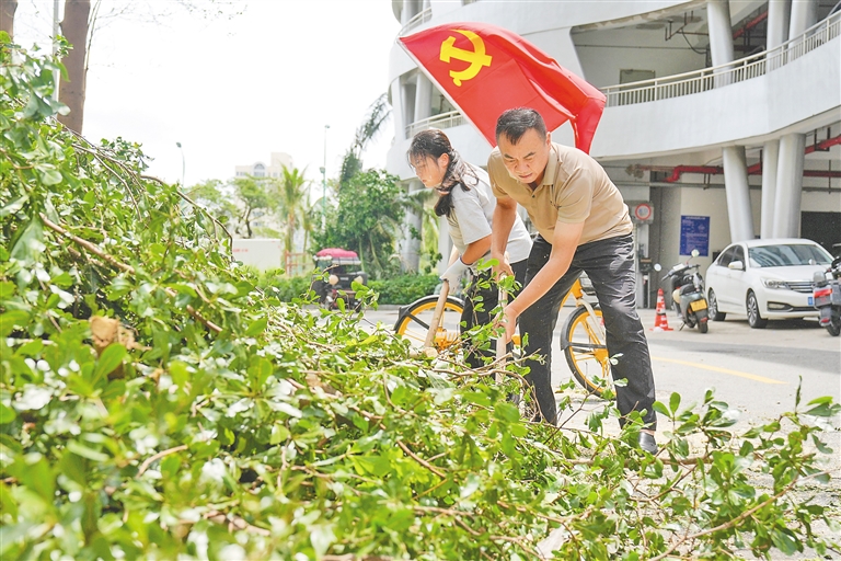 今年8月,台风“剑鱼”重创三亚。图为台风过后,三亚市群众街社区党员干部冲在一线,清理社区主干道上的树枝。海南日报全媒体记者 王程龙 摄