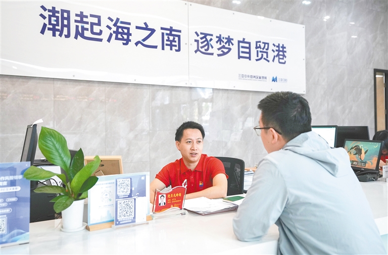 三亚中央商务区管理局设立党员先锋岗,为园区企业服务。图为工作人员(左)为园区项目建设企业介绍有关政策。海南日报全媒体记者 王程龙 摄