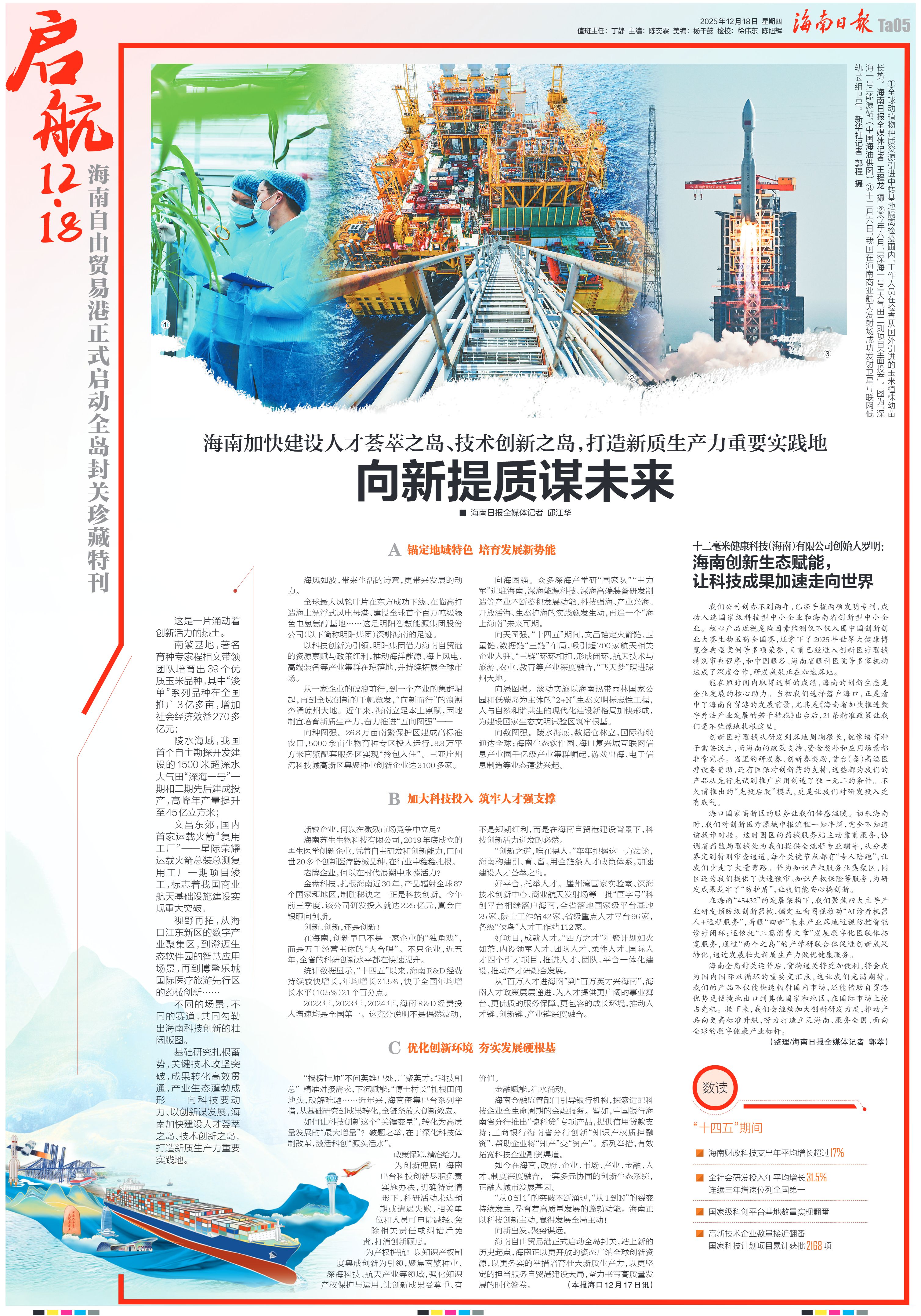 基础研究扎根蓄势,关键技术攻坚突破,成果转化高效贯通,产业生态蓬勃成形——向科技要动力、以创新谋发展,海南加快建设人才荟萃之岛、技术创新之岛,打造新质生产力重要实践地。