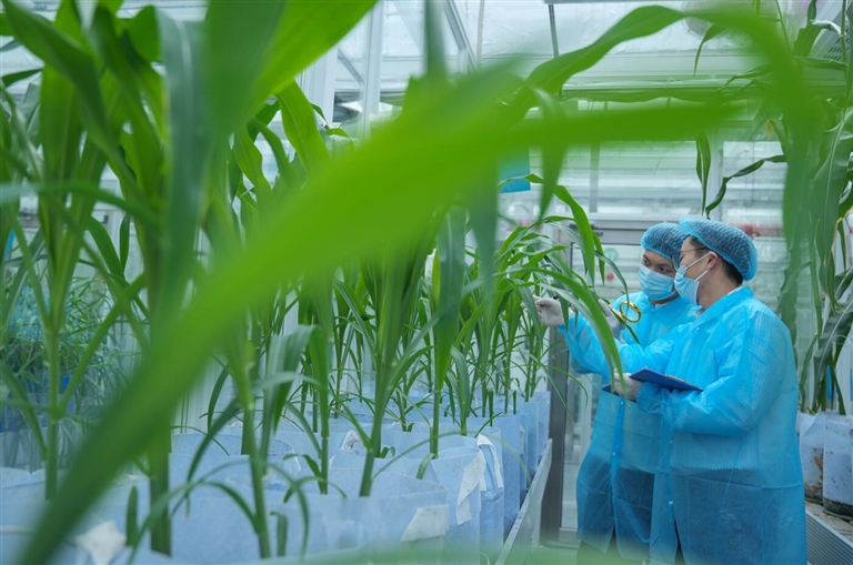 全球动植物种质资源引进中转基地隔离检疫圃内,工作人员在检查从国外引进的玉米植株幼苗长势。海南日报全媒体记者 王程龙 摄