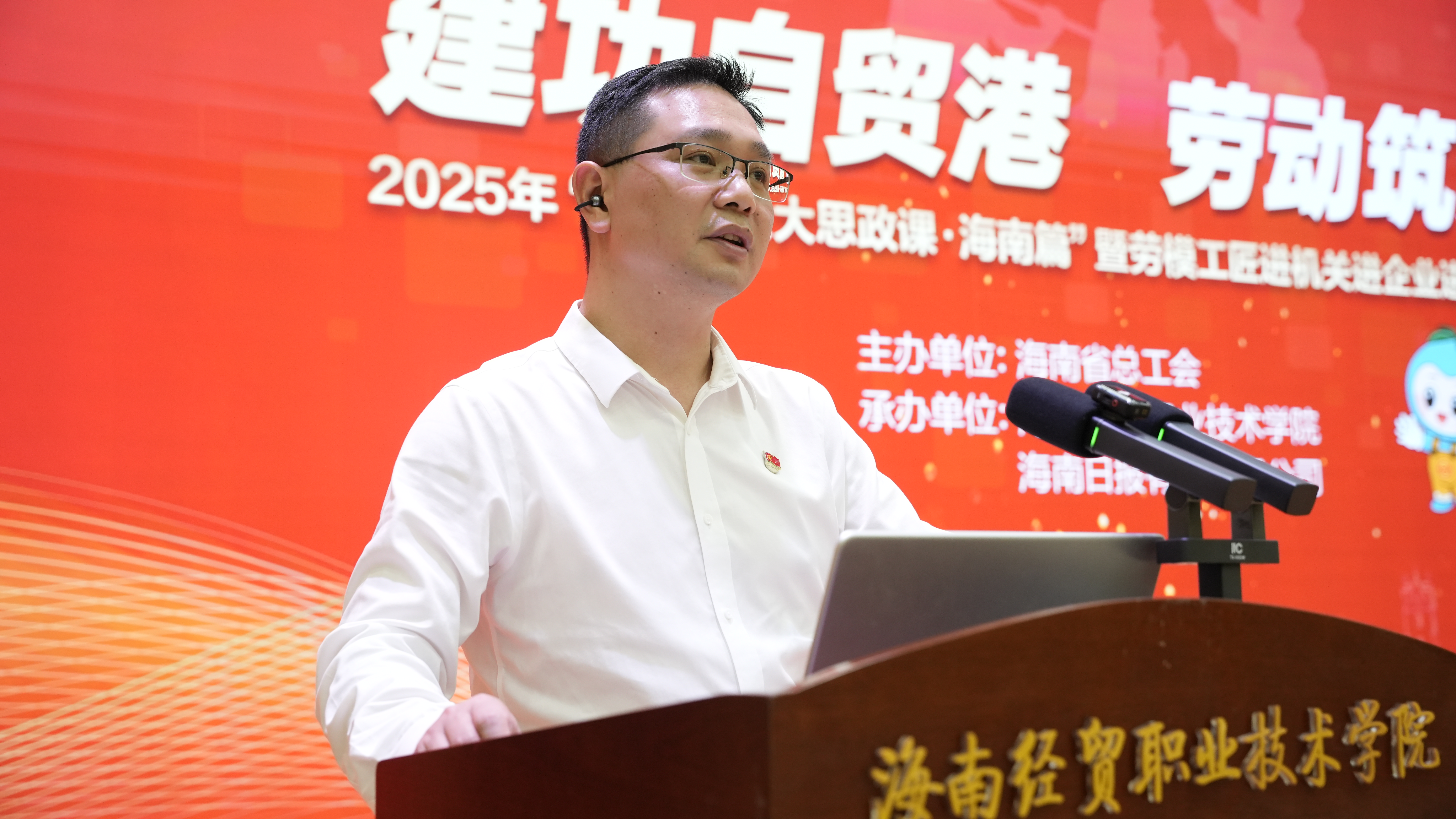 12月17日, 以“建功自贸港 劳动筑梦想”为主题的2025年“中国工人大思政课·海南篇”暨劳模工匠宣讲活动在海南经贸职业技术学院开讲。全国劳动模范、海航航空技术有限公司副总裁易从涛,海南省劳动模范、海南吉羽物业服务有限公司副总经理冯发姑登台分享,用扎根岗位的奋斗故事、攻坚克难的实干精神,为现场师生上了一堂生动深刻的思政课。