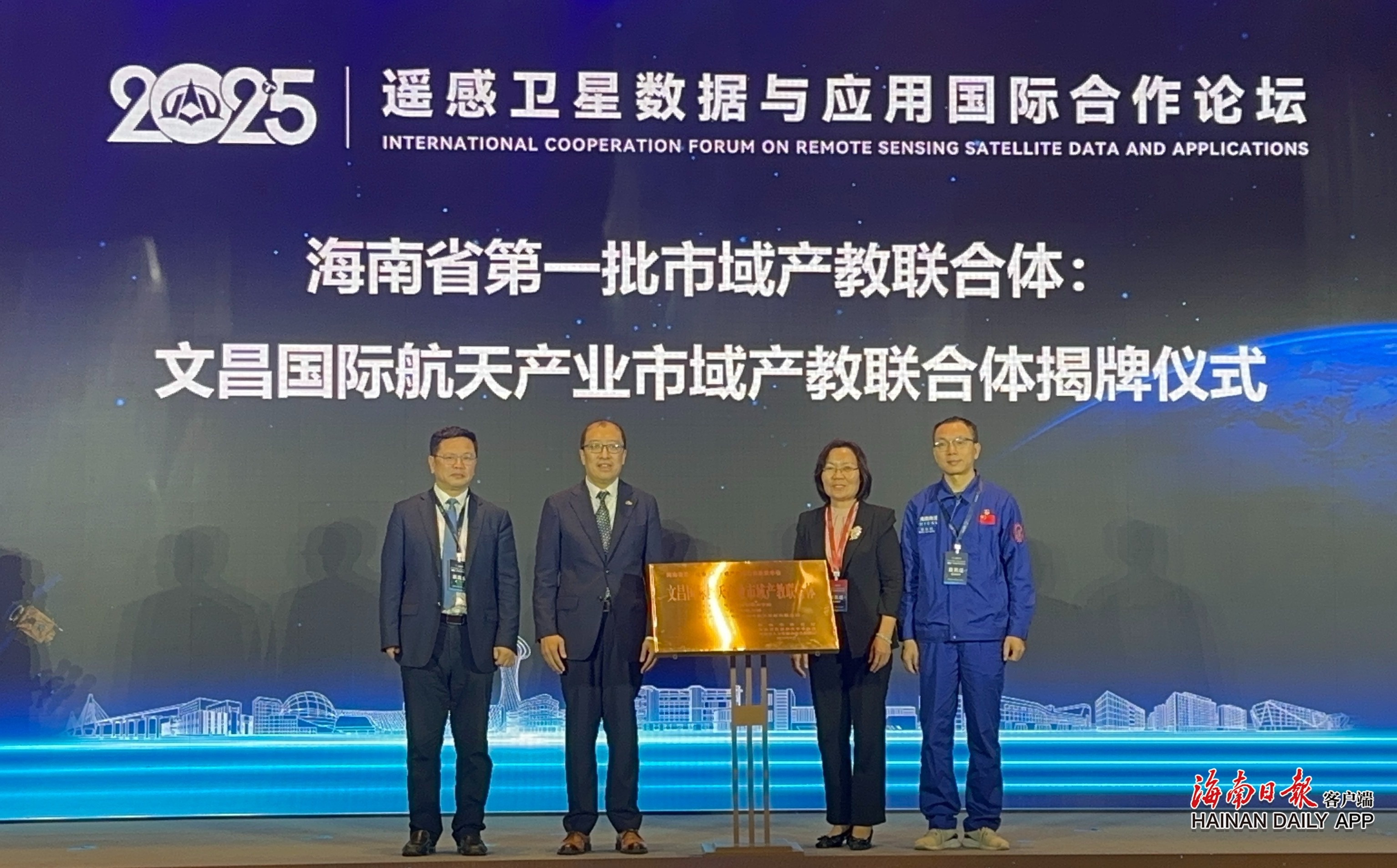揭牌仪式上,海南国际商业航天发射有限公司总经理助理首俊明、文昌国际航天城管理局副局长王凤宇、文昌市副市长韩亮、海南外国语职业学院校长黄学彬共同为联合体揭牌。