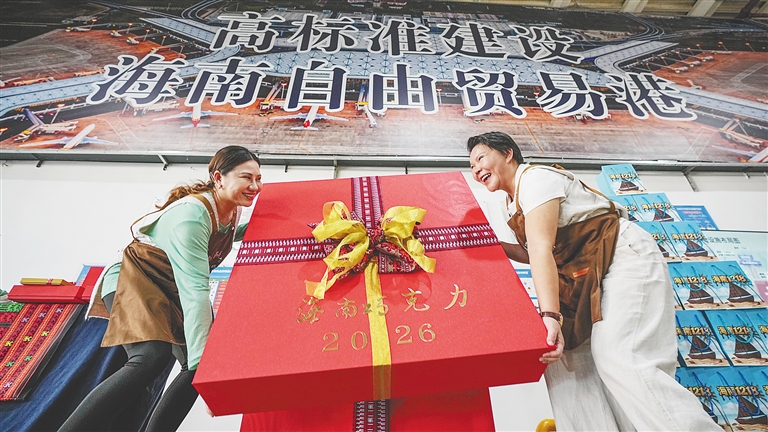 2025年12月18日,海口美兰机场“二线口岸”,工作人员共同打开海南巧克力大礼盒。当天,海南自贸港全岛封关正式启动,这批巧克力由海南一家外商投资食品企业生产,经海关监管通道高效通关。这是海南自贸港全岛封关后,海口美兰机场“二线口岸”第一批通关的加工增值内销免关税货物。