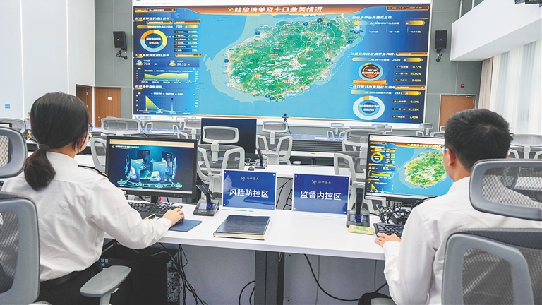2025年11月3日,海口海关业务运行监控中心,工作人员在测试海南自由贸易港海关智慧监管平台的运行情况。为保障海南自贸港封关运作平稳有序,海口海关打造涵盖业务管控、监控指挥、风险防控、监督内控于一体的“四控一体”指挥体系,实现“‘一线’放开、‘二线’管住、岛内自由”的同时,确保管得住、放得开、通得快。