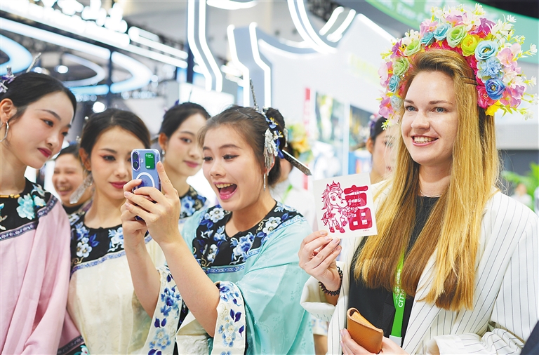 2025年12月19日,2025中国国际旅游交易会在海口开幕,参会外籍嘉宾头戴簪花开心留影。据了解,这是海南自贸港全岛封关正式启动后,海南举办的首场高规格旅游盛会,吸引了来自101个国家和地区的1000余名旅行商及代表参会。