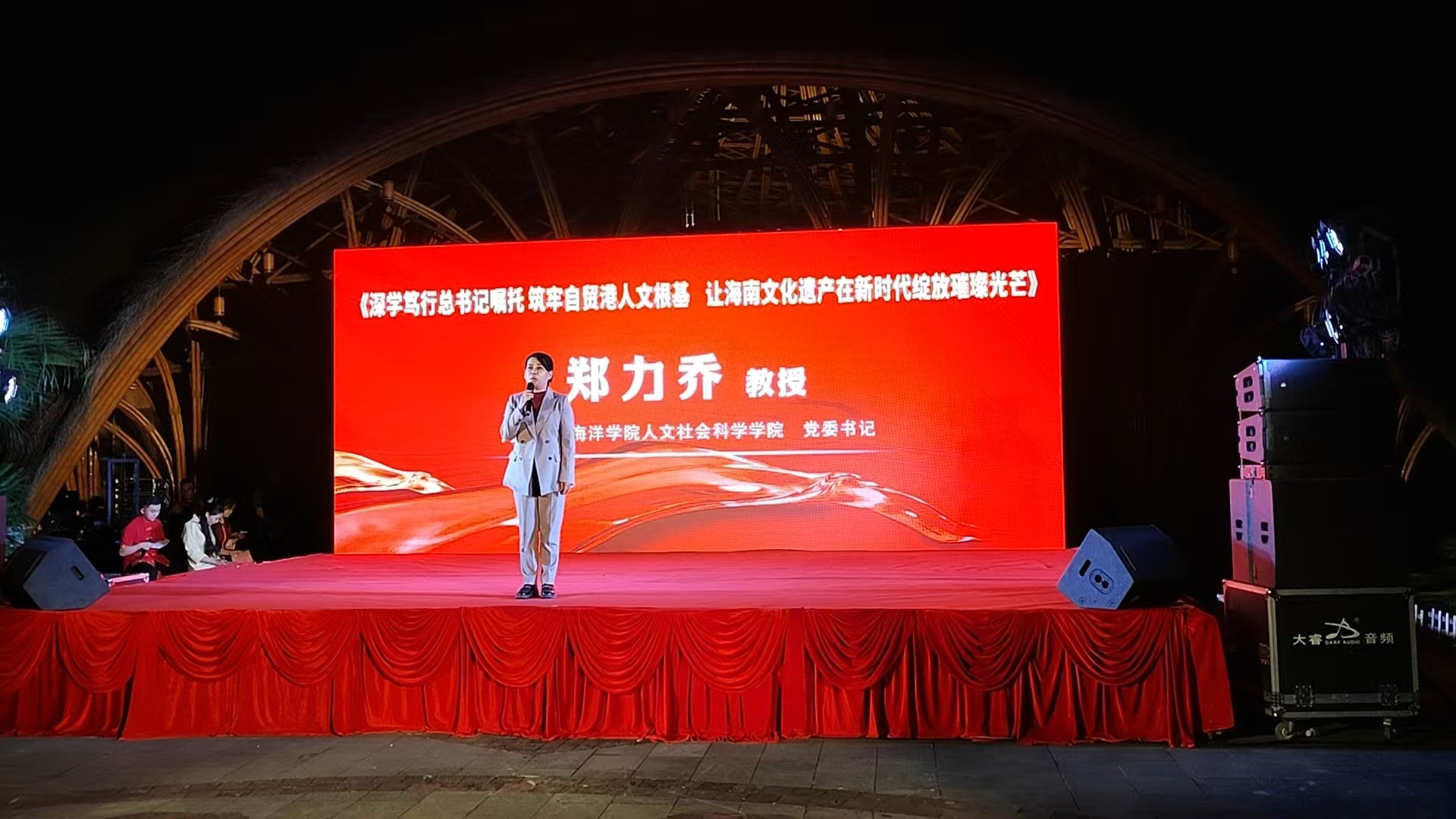 海南热带海洋学院人文社会科学学院党委书记郑力乔以《深学笃行习近平总书记嘱托 筑牢自贸港人文根基 让海南文化遗产在新时代绽放璀璨光芒》为宣讲主题,讲述自贸港建设者如何以行动践行习近平总书记嘱托,让文化遗产在新时代焕发新生,为海南发展筑牢人文根基、注入精神力量。《新门户 金钥匙 新征程》《共建自贸港 山海税力量》等节目,以“小故事”阐释“大道理”,深入浅出地讲解了海南自贸港封关运作的核心内容、重大机遇及其对百姓生活的积极影响。在《铭记春天的嘱托》节目中,五指山基层干部结合亲身经历,分享了投身乡村振兴、见证家乡巨变的深切体会,展现了毛纳村在产业发展、生态文明等领域取得的丰硕成果。