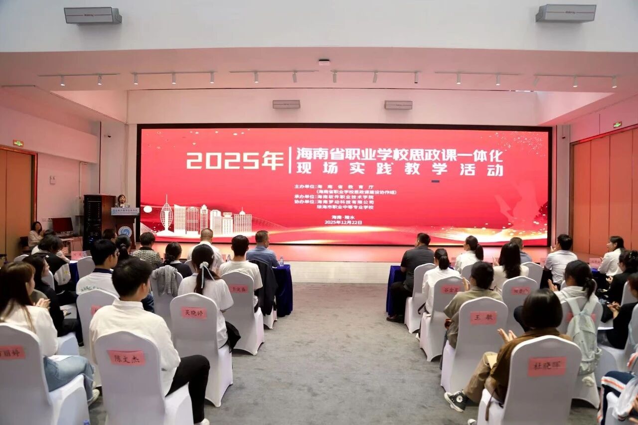 12月22日,2025年海南省职业学校思政课一体化“校企协同 德技并修”主题现场实践教学活动在陵水海归小镇举行。本次活动由海南省教育厅(海南省职业学校思政课建设协作组)主办,海南软件职业技术学院承办,海南梦动科技有限公司、琼海市职业中等专业学校协办,全省20所职业院校及相关单位的70余名思政教育工作者与学生共同参与。