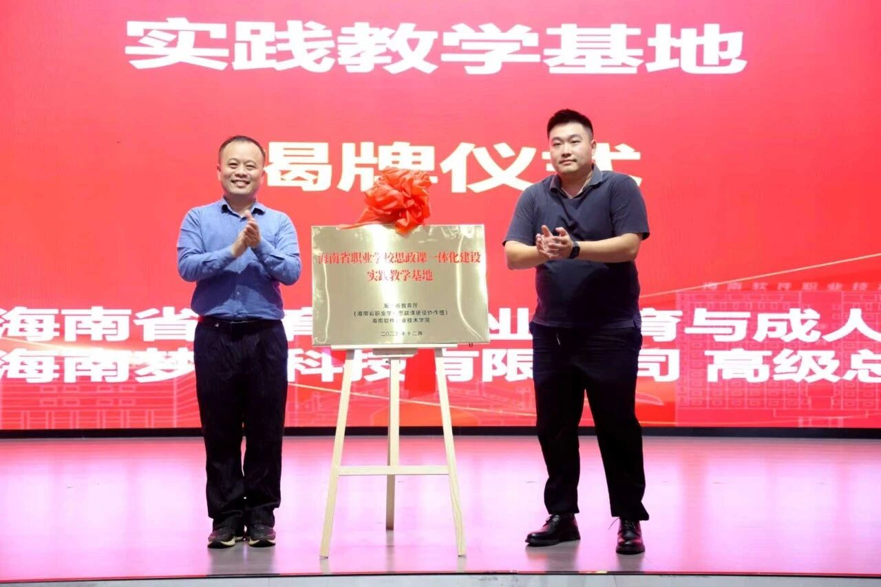 活动期间,海南省教育厅(海南省职业学校思政课建设协作组)与海南梦动科技有限公司在陵水海归小镇会议中心举行了“海南省职业学校思政课一体化建设实践教学基地”揭牌仪式。海南省教育厅职成处处长赵克、海南软件职业技术学院党委副书记刘明鹏、海南梦动科技有限公司高级总监林君出席仪式并讲话。仪式由该校马克思主义学院院长王晓琳主持。