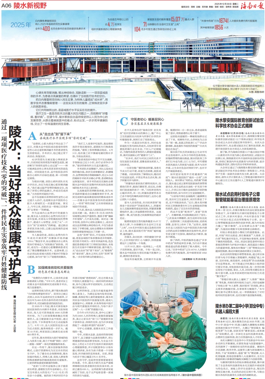 医疗卫生一直是百姓关注的重大民生问题之一,百姓期待“好看病、看好病”。回望今年,陵水黎族自治县持续坚持以人民为中心的发展思想,从群众看病就医中的难点、盼点出发,一步步筑牢健康防线,交出了一份有温度的民生答卷。