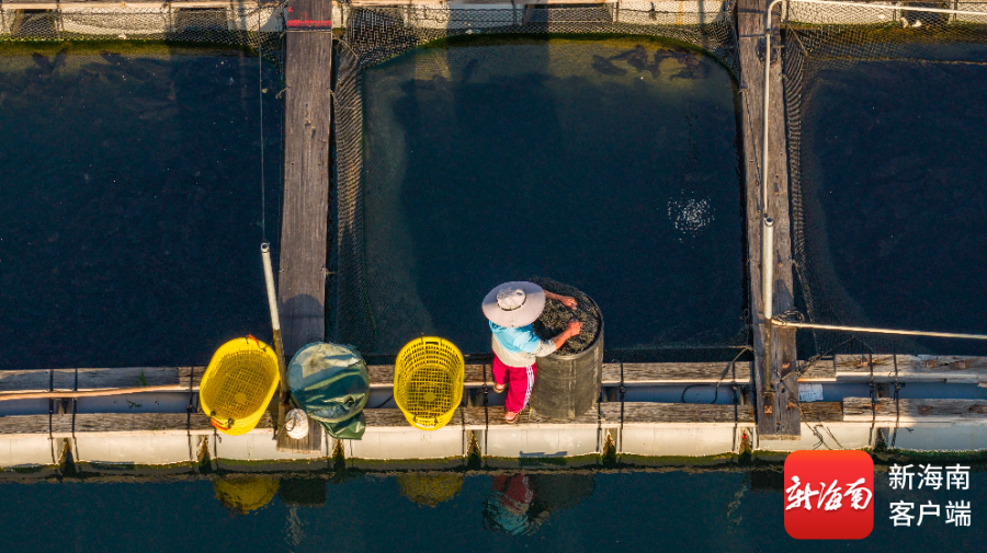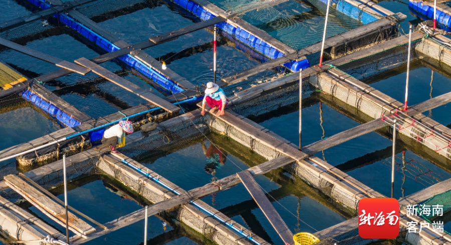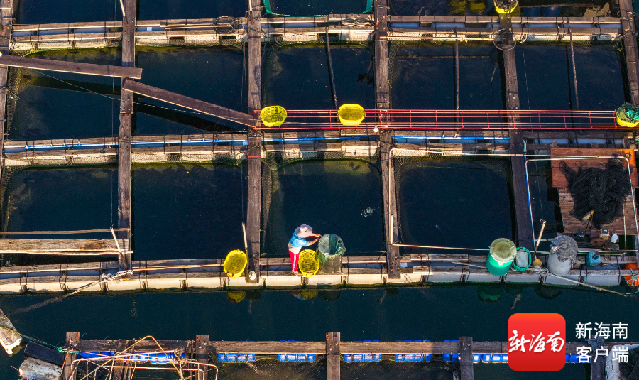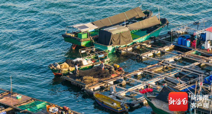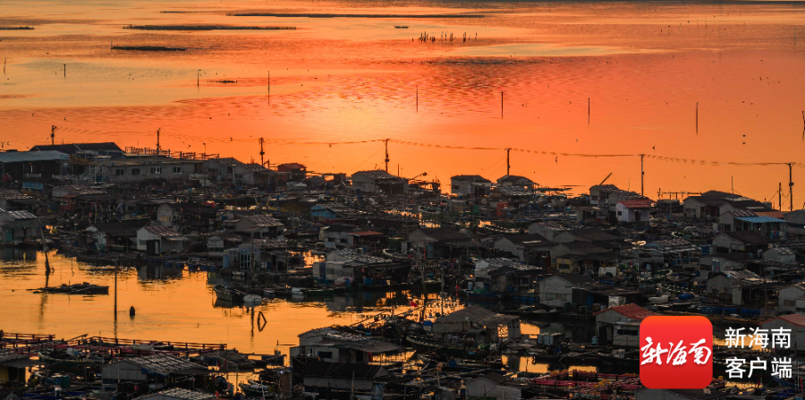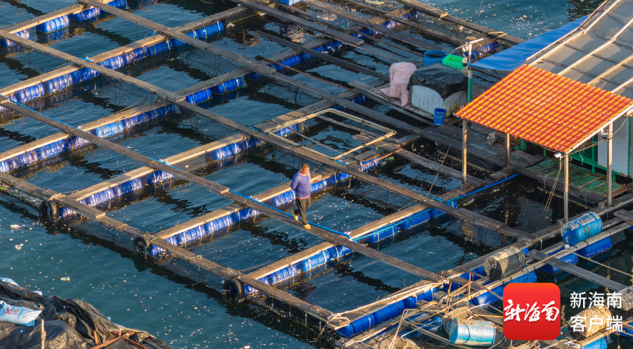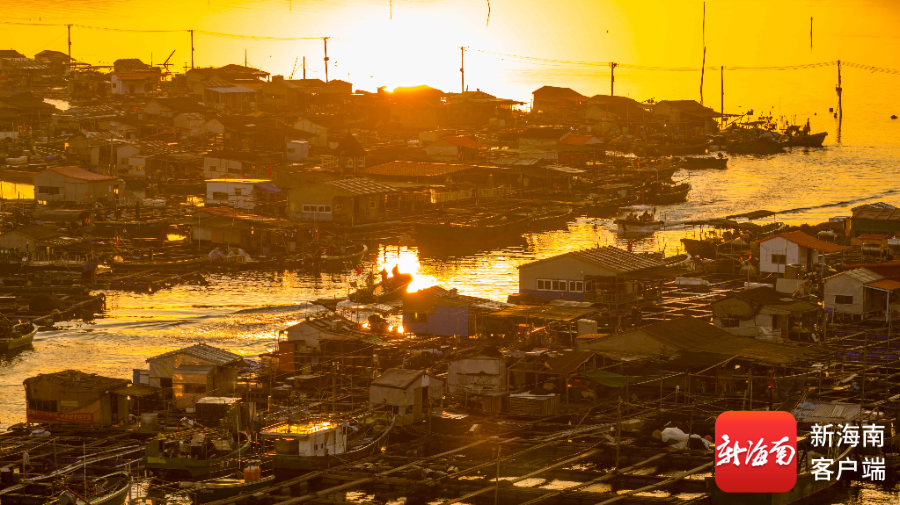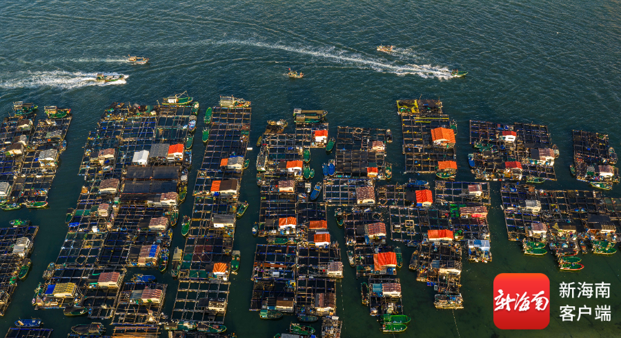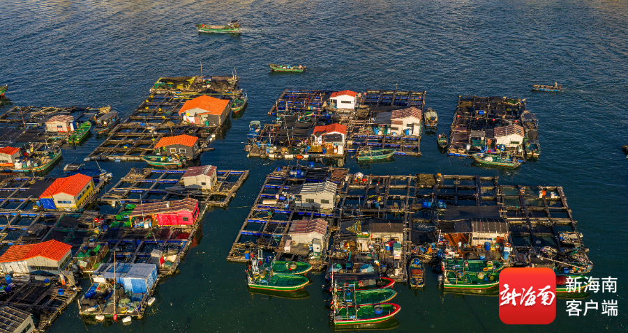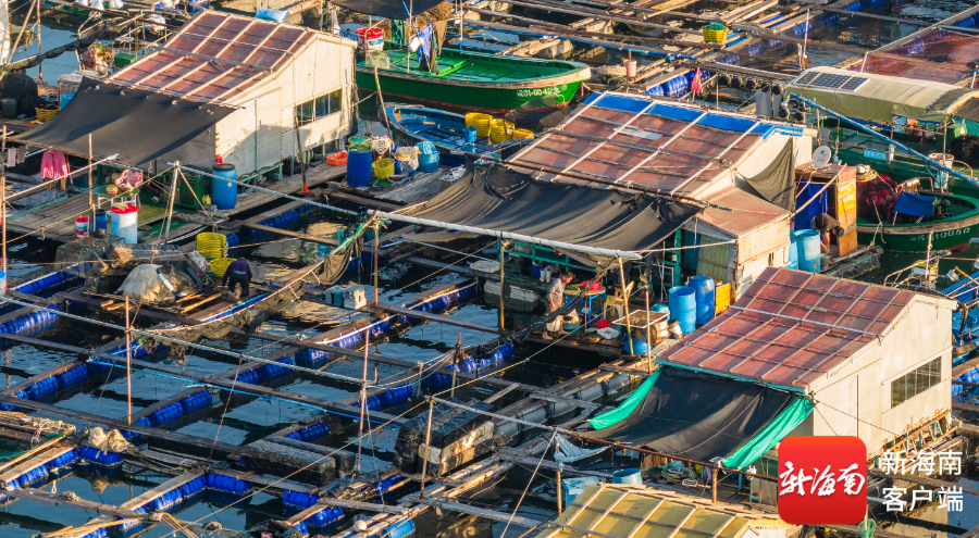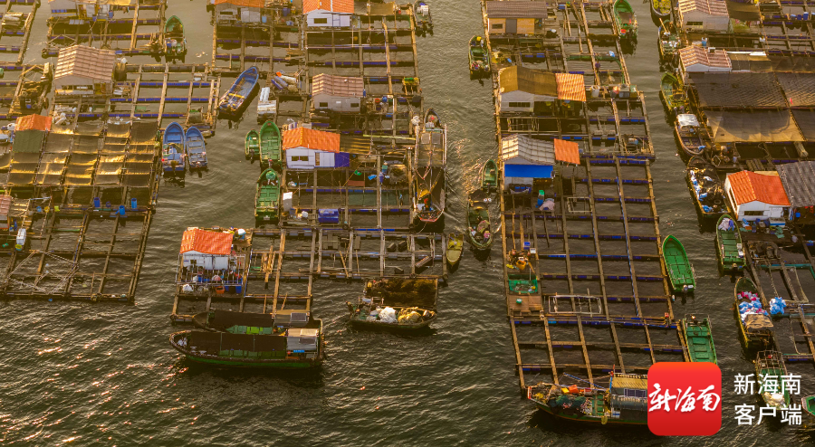 在海上,疍家渔排如“海上村落”般鳞次栉比,“井”字形网箱将海面勾勒出规整的轮廓。红顶木屋在晨光中泛着温暖的光泽,宛如散落在碧波上的明珠。