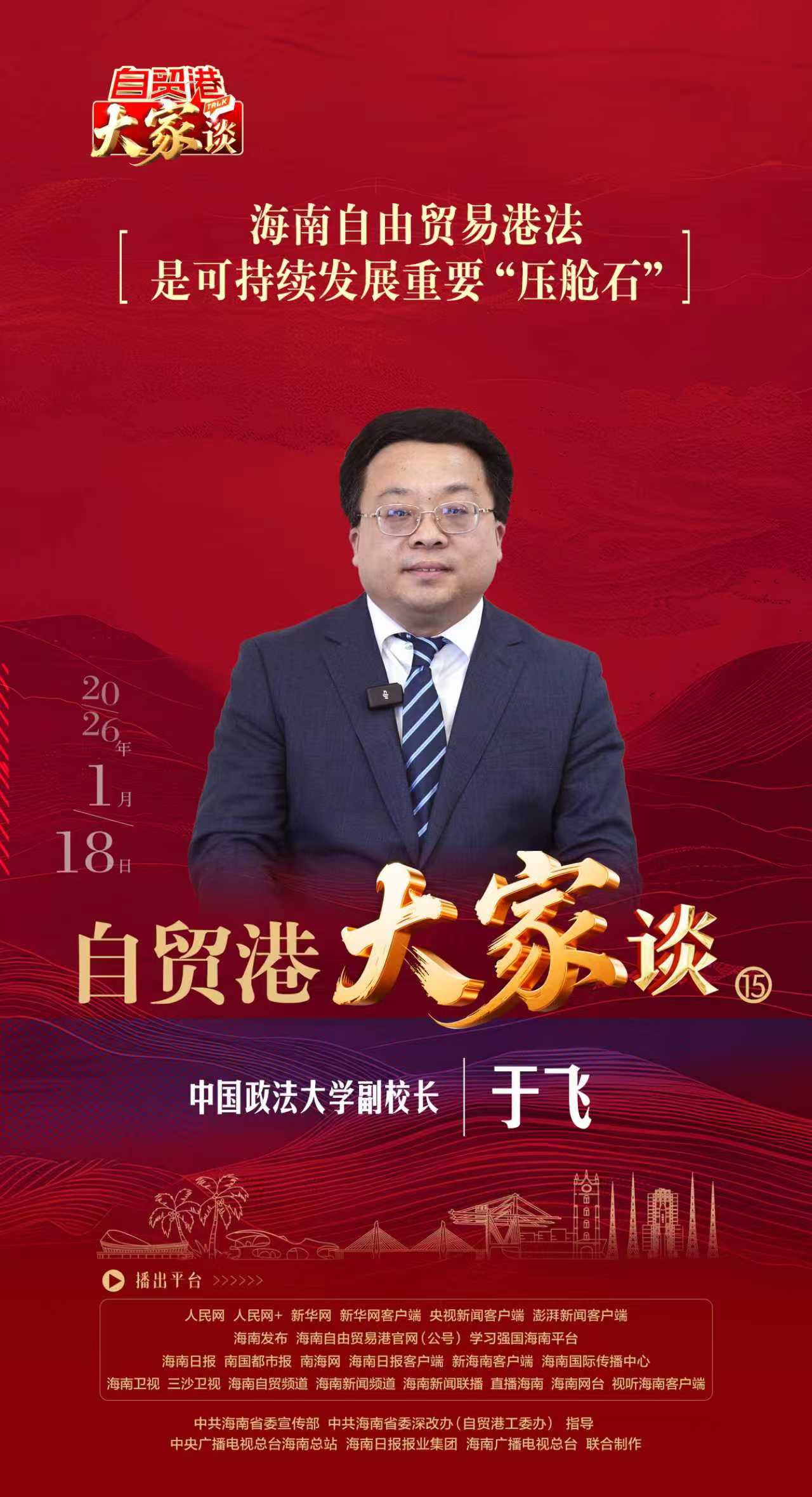 全岛封关后,开放的大门越开越大,如何发挥好海南自由贸易港法“压舱石”作用?在对接国际高标准经贸规则中,又该如何打造市场化、法治化、国际化一流营商环境?《自贸港“大家”谈》将于1月18日播出第十五期,对话中国政法大学副校长于飞。