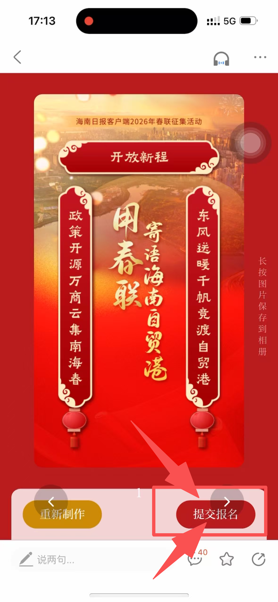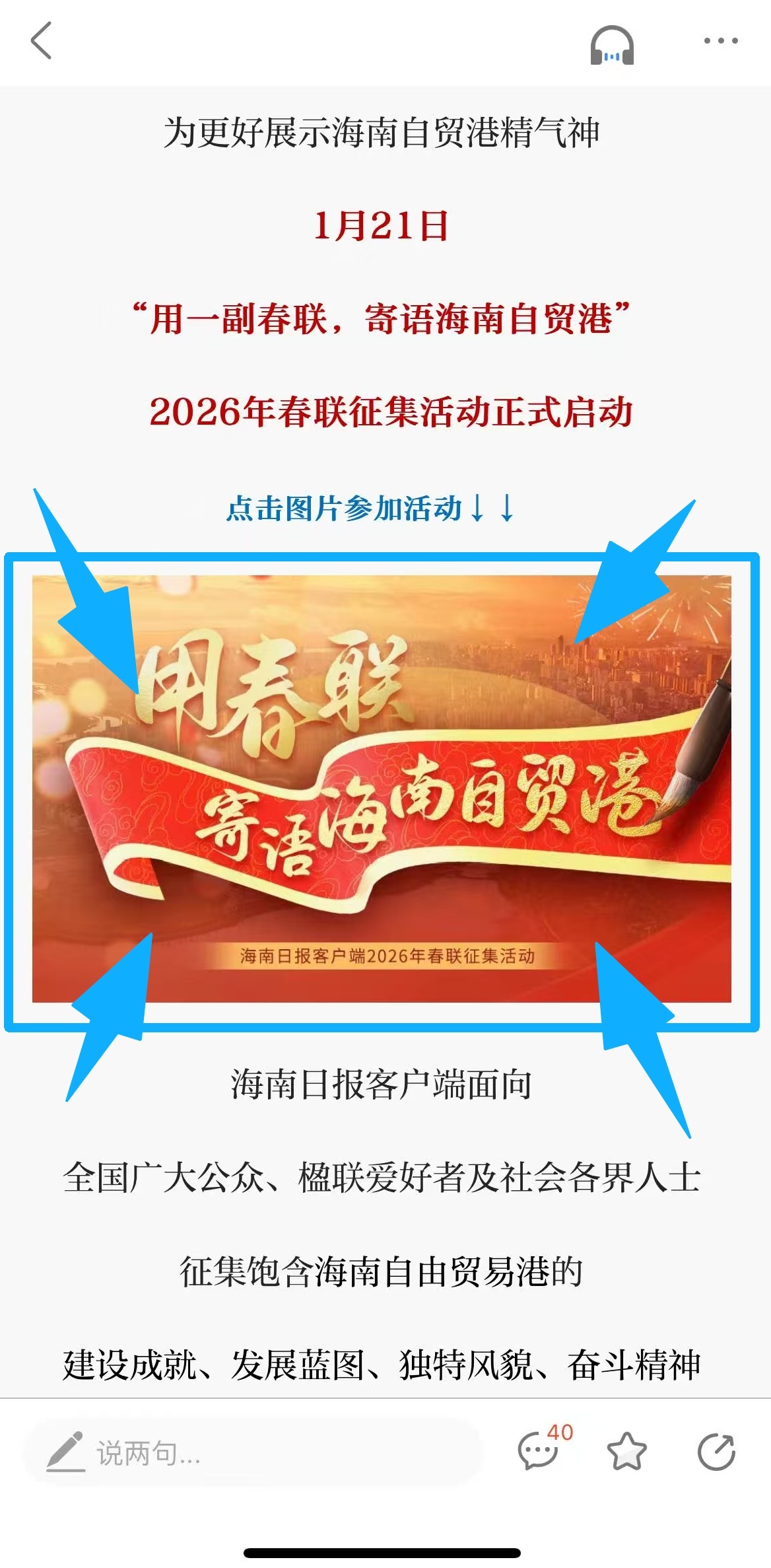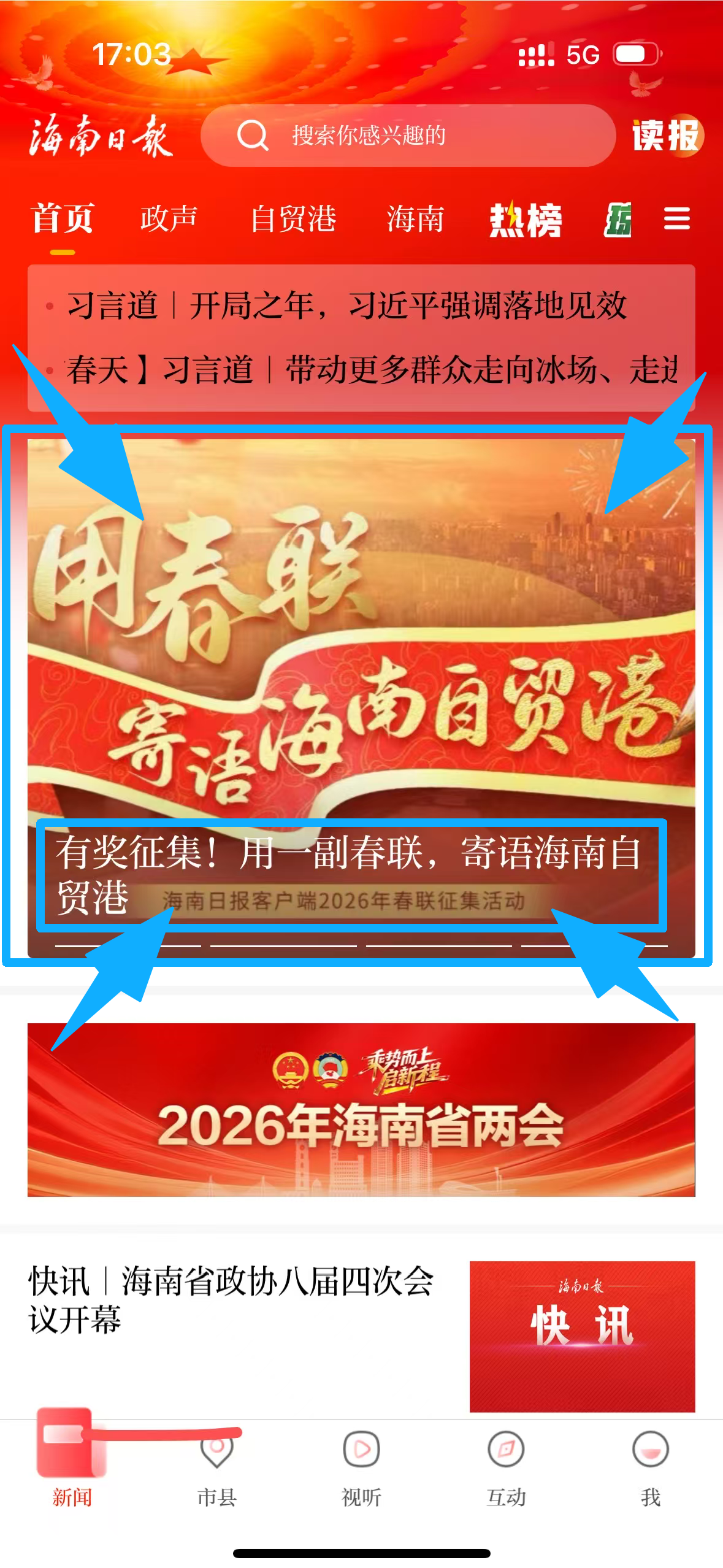 1、下载海南日报客户端App,在首页轮播位置找到《有奖征集!用一副春联,寄语海南自贸港》稿件,点击进入稿件。