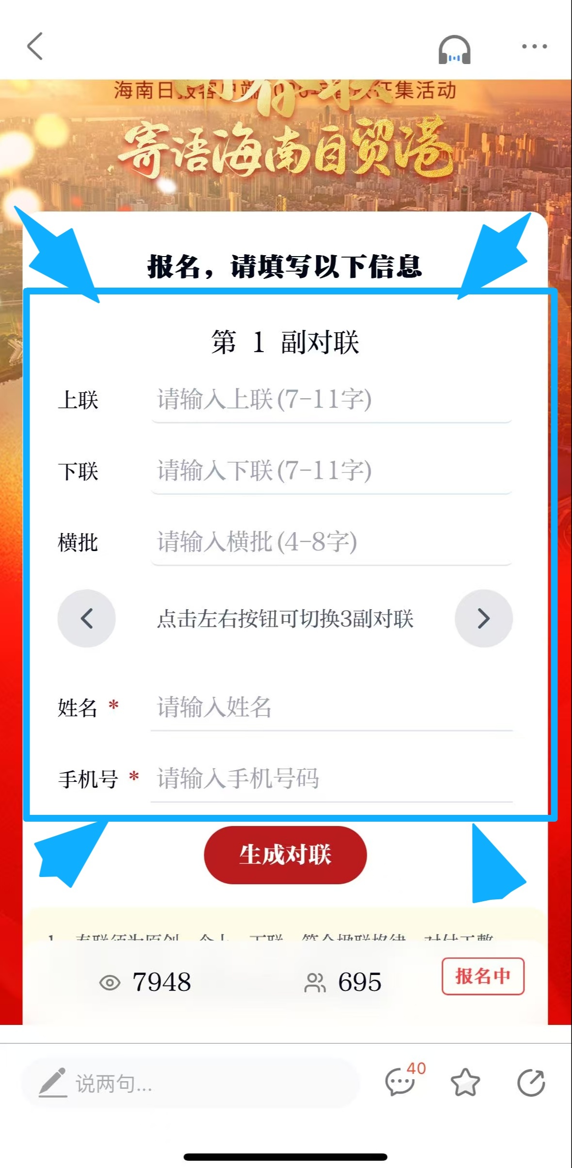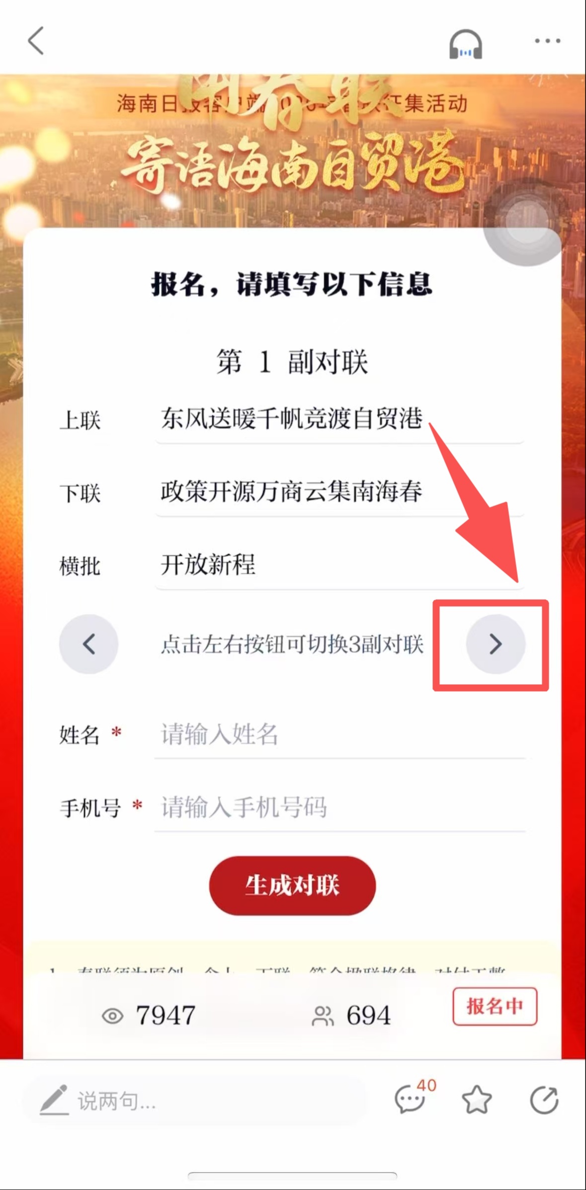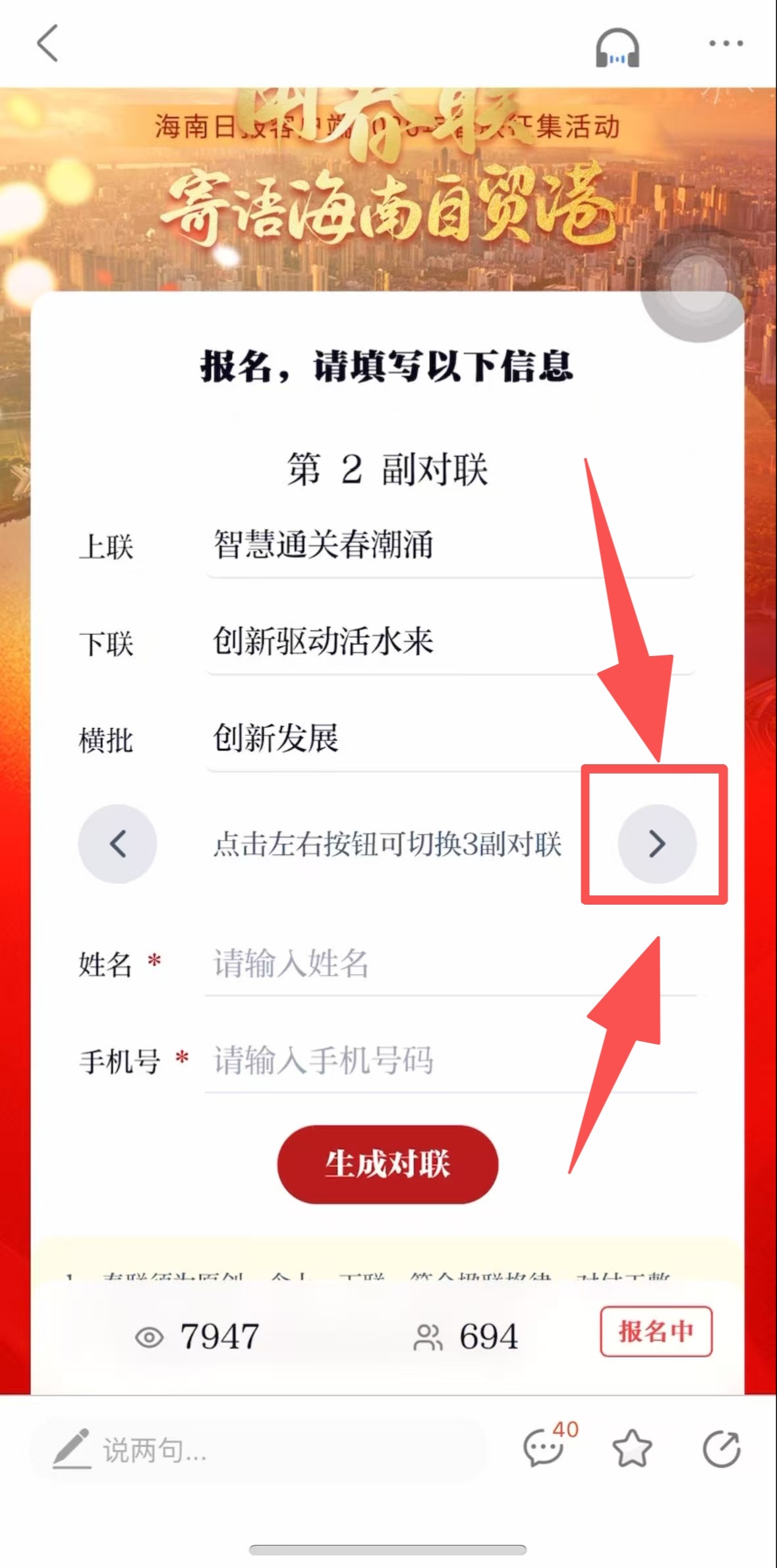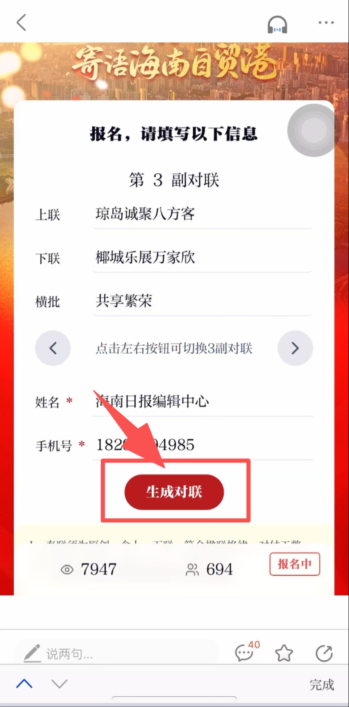 4.并在对应位置填入上联、下联横批,如果想投稿三副春联,可点击右边按钮进入第二副春联的填写位置,重复上述操作即可完成第二、三副春联的填写,并在下方姓名、电话位置填入相关信息,点击“生成春联”即可生成春联的效果图,长按图片即可保存在相册里,分享给亲朋好友。