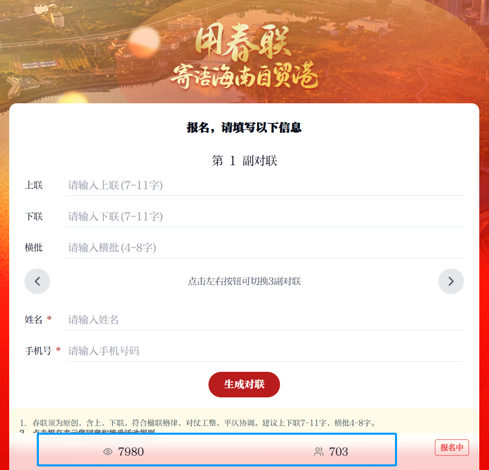 需要注意的是,一个手机号只有一次投稿机会,只要最后不点击“提交报名”,都可以返回前面的操作,重新填写、修改上联、下联、横批等内容。