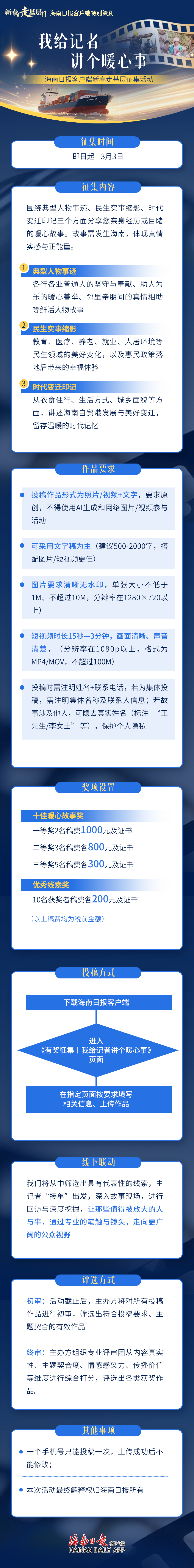 即日起至3月3日(元宵节),打开海南日报客户端,进入“我给记者讲个暖心事”活动专区,即可上传你的温暖线索。我们设立了“十佳暖心故事奖”与“优秀线索奖”,向每一份真诚的分享致以谢意。